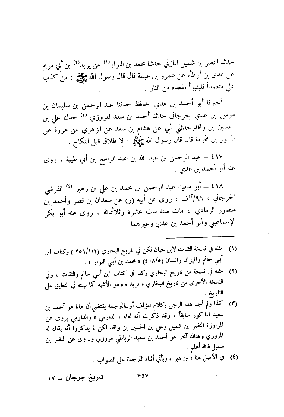 418- أَبُو سَعِيد عَبْدِ الرَّحْمَنِ بْنِ مُحَمَّدِ بْنِ عَلِي بْن زُهَيْر4 القرشي الْجُرْجَانِي 96/ألف رَوَى عَنْ أَبِيهِ وعن سعدان بْن نصر وَأَحْمَد بْن مَنْصُور الرمادي مَات سَنَة ست عشرة وثلاثمائة روى عنه أَبُو بكر الإسماعيلي وأبو أَحْمَد بْن عدي وغيرهما.