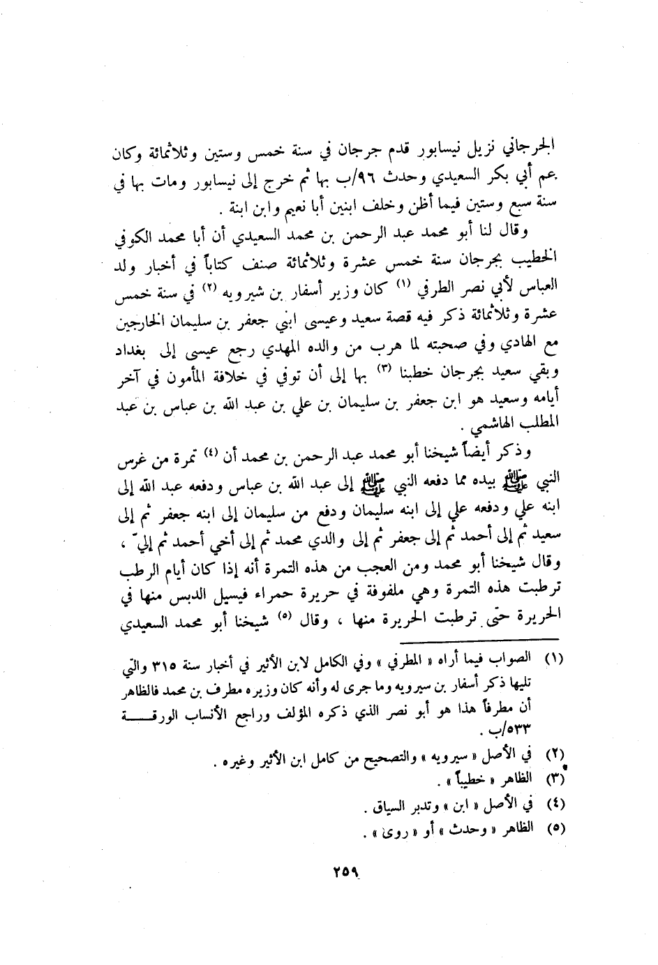 وَقَالَ لنا أَبُو مُحَمَّد عَبْد الرَّحْمَنِ بْن مُحَمَّد السعيدي إِن أبا مُحَمَّد الكوفي الخطيب بِجُرْجَانَ سَنَة خمس عشرة وثلاثمائة صنف كتابا فِي أخبار ولد الْعَبَّاس لأبي نصر الطرفي1 كَانَ وزير أسفار بْن شيرويه2 فِي سَنَة خمس عشرة وثلاثمائة ذكر فِيهِ قصة سعيد وعيسى ابني جَعْفَر بْن سُلَيْمَان الخارجين مَعَ الهادي وَفِي صحبته لما هرب من والده الْمَهْدِي رجع عِيسَى إِلَى بغداد وبقي سَعِيد بِجُرْجَانَ خطبنا3 بِهَا إِلَى أَن توفي فِي خلافة الْمَأْمُون فِي آخر أيامه وسعيد هو بن جَعْفَر بْن سُلَيْمَان بْن عَلِي بْن عَبْد اللَّهِ بْن عَبَّاس بْن عَبْد المطلب الهاشمي.