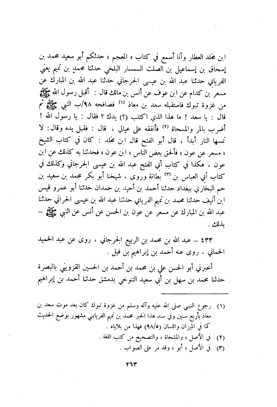 ابن مَخْلَدٍ الْعَطَّارِ وَأَنَا أَسْمَعُ فِي كِتَابِ الْمُعْجَمِ حَدَّثَكُمْ أَبُو سَعِيدٍ مُحَمَّدُ بْنُ إِسْحَاقَ بْنِ إِسْمَاعِيلَ بْنِ الصَّلْتِ السِّمْسَارُ الْبَلْخِيُّ حَدَّثَنَا مُحَمَّدُ بْنُ تَمِيمٍ يَعْنِي الْفَرْيَابِيَّ حَدَّثَنَا عَبْدُ اللَّهِ بْنُ عِيسَى الْجُرْجَانِيُّ حَدَّثَنَا عَبْدُ اللَّهِ بْنُ الْمُبَارَكِ عَنْ مِسْعَرِ بْنِ كُدَامٍ عن بن عَوْفٍ عَنْ أَنَسِ بْنِ مَالِكٍ قَالَ أَقْبَلَ رَسُولُ اللَّهِ صَلَّى اللَّهُ عَلَيْهِ وَسَلَّمَ مِنْ غَزْوَةِ تَبُوكٍ فَاسْتَقْبَلَهُ سَعْدُ بْنُ مُعَاذٍ1 فصافحه 98/ب النبي صلى اللَّه عليه وسلم ثُمَّ قَالَ: "يَا سَعْدُ مَا هَذَا الَّذِي اكْتَتَبَ يَدَكَ"؟ فَقَالَ: يَا رَسُولَ اللَّهِ أَضْرِبُ بِالمرِ وَالْمِسْحَاةِ2 فَأُنْفِقُهُ عَلَى عِيَالِي قَالَ: فَقَبَّلَ يَدَهُ وَقَالَ: "لا تَمَسَّهَا النَّارُ أَبَدًا" قَالَ أَبُو الفتح قَالَ ابْن مخلد كَانَ فِي كِتَاب الشيخ مسعر عَنْ عون فألحق بَعْض النَّاس بْن عون فحدثنا به كذلك عن بن عون هكذا فِي كِتَاب أَبِي الفتح عَبْد اللَّهِ بْن عِيسَى الْجُرْجَانِي وَكَذَلِكَ فِي كِتَاب أَبِي الْعَبَّاس بْن3 بطانة وَرَوَى شيخنا أَبُو بَكْر مُحَمَّد بْن سَعِيد بْن حم الْبُخَارِي بِبَغْدَادَ حَدَّثَنَا أَحْمَد بْن أحيد بْن حمدان حَدَّثَنَا أَبُو عَمْرو قَيْس بْن أنيف حَدَّثَنَا مُحَمَّد بْن تميم الْفَرْيَابِيَّ حَدَّثَنَا عَبْدُ اللَّهِ بْنُ عِيسَى الحراني حَدَّثَنَا عَبْد اللَّهِ بْن المبارك عَنْ مسعر عَنْ عون بْن الْحَسَن عَنْ أَنَس عَن ِالنَّبِيِّ صَلَّى اللَّهُ عَلَيْهِ وَسَلَّمَ بِذَلِكَ.