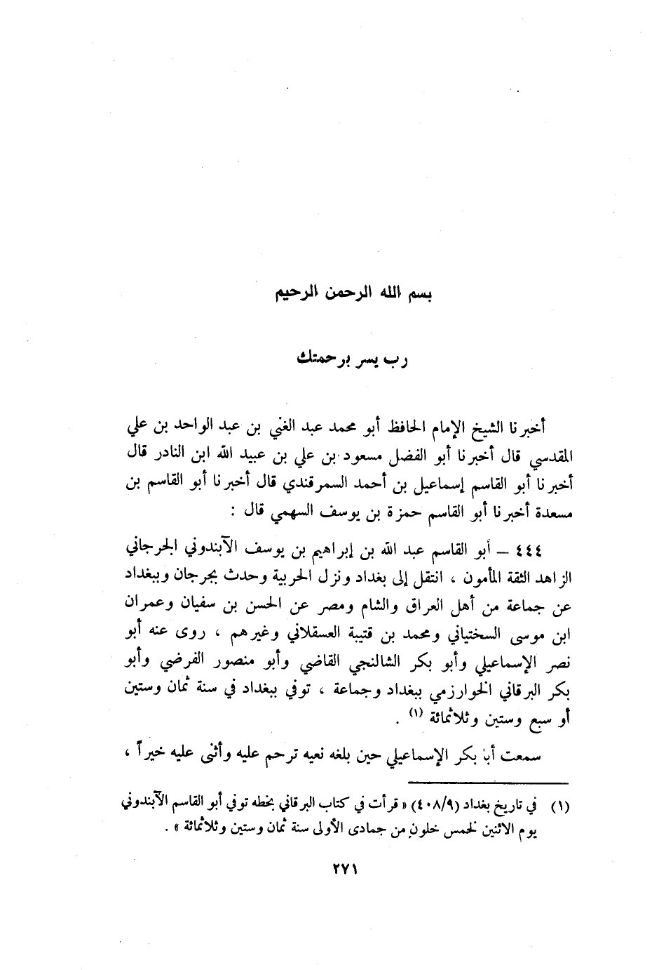 أخبرنا الشيخ الإمام الحافظ أبو محمد عبد الغني بن عبد الواحد بن علي المقدسي قال أخبرنا أبو الفضل مسعود بن علي بن عبيد الله بن النادر قال أخبرنا أَبُو الْقَاسِمِ إِسْمَاعِيلُ بْنُ أَحْمَدَ السمرقندي قال أخبرنا أبو القاسم بن مسعدة أخبرنا أبو القاسم حمزة بن يوسف السهمي قال.