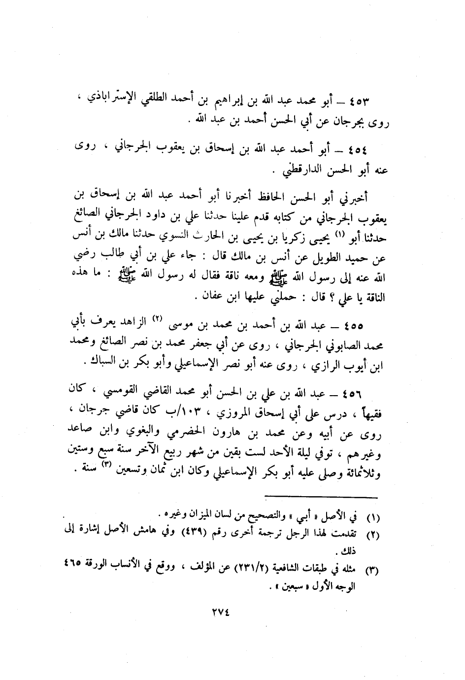 454- أَبُو أَحْمَد عَبْد اللَّهِ بْن إِسْحَاق بْن يَعْقُوب الْجُرْجَانِي رَوَى عَنْهُ أَبُو الْحَسَن الدارقطني. أَخْبَرَنِي أَبُو الْحَسَنِ الْحَافِظُ أَخْبَرَنَا أَبُو أَحْمَد عَبْد اللَّهِ بْن إِسْحَاق بْنِ يَعْقُوبَ الْجُرْجَانِيُّ مِنْ كِتَابِهِ قَدِمَ عَلَيْنَا حَدَّثَنَا عَلِيُّ بْنُ دَاوُدَ الْجُرْجَانِيُّ الصَّائِغُ حَدَّثَنَا أَبُو1 يَحْيَى زَكَرِيَّا بْنُ يَحْيَى بْنِ الْحَارِثِ النَّسَوِيُّ حَدَّثَنَا مَالِكُ بْنُ أَنَسٍ عَنْ حُمَيْدٍ الطَّوِيلِ عَنْ أَنَسِ بْنِ مَالِكٍ قَالَ جَاءَ عَلِيّ بْن أَبِي طالب رضي اللَّهُ عَنْهُ إِلَى رَسُولِ اللَّهِ صَلَّى اللَّهُ عَلَيْهِ وَسَلَّمَ وَمَعَهُ نَاقَةٌ فَقَالَ لَهُ رَسُولُ اللَّهِ صَلَّى اللَّهُ عَلَيْهِ وَسَلَّمَ: "مَا هَذِهِ النَّاقَةُ يَا عَلِيُّ"؟ قَالَ حملني عليها بن عَفَّانَ.
