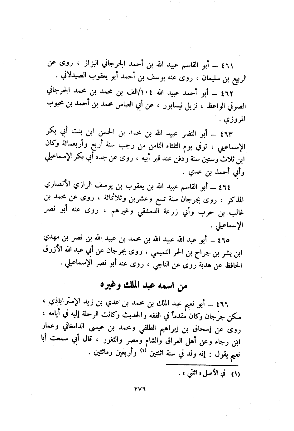 461 - أَبُو الْقَاسِم عُبَيْد اللَّهِ بْن أَحْمَدَ الْجُرْجَانِي البزاز رَوَى عَنِ الرَّبِيع بْن سُلَيْمَان رَوَى عَنْهُ يُوسُف بْن أَحْمَدَ أَبُو يَعْقُوب الصيدلاني.