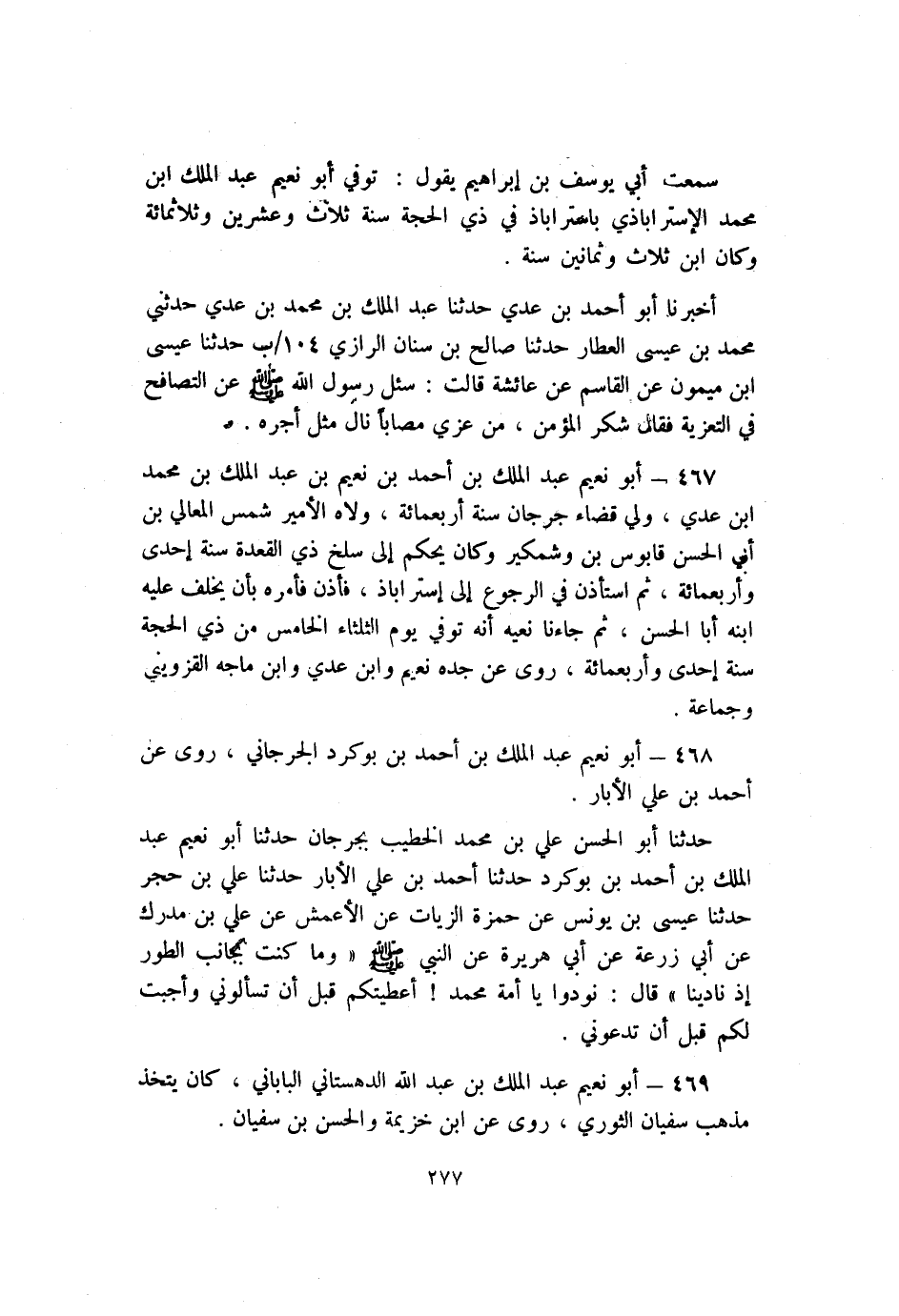 467 - أَبُو نعيم عَبْد الْمَلِك بْن أَحْمَدَ بْن نعيم بْن عَبْدُ الْمَلِكِ بْنُ مُحَمَّدِ بْنِ عَدِي ولي قضاء جُرْجَان سَنَة أربعمائة ولاه الأمير شمس المعالي بْن أَبِي الْحَسَن قابوس بْن وشمكير وَكَانَ يحكم إِلَى سلخ ذي القعدة سَنَة إحدى وأربعمائة ثُمَّ استأذن فِي الرجوع إِلَى إستراباذ فأذن فأمره بأن يخلف عَلَيْهِ ابنه أبا الْحَسَن ثُمَّ جاءنا نعيه أَنَّهُ توفي يَوْم الثلثاء الخامس من ذي الحجة سَنَة إحدى وأربعمائة رَوَى عَنْ جَده نعيم وابن عَدِي وابن ماجة القزويني وجماعة.