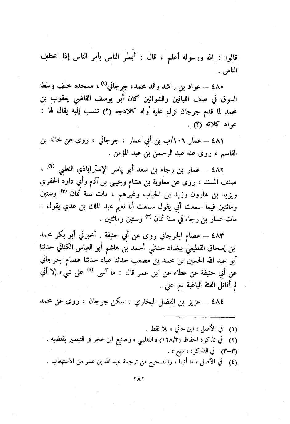 483- عِصَام الْجُرْجَانِي رَوَى عَنْ أَبِي حَنِيفَة أَخْبَرَنِي أَبُو بَكْر مُحَمَّد بْن إِسْحَاق القطيعي بِبَغْدَادَ حَدَّثَنِي أَحْمَد بْن هاشم أَبُو الْعَبَّاس الكناني حَدَّثَنَا أَبُو عَبْد اللَّهِ الْحُسَيْنُ بْنُ مُحَمَّدِ بْنِ مُصْعَب حَدَّثَنَا عباد حَدَّثَنَا عِصَام الْجُرْجَانِي عَنْ أَبِي حَنِيفَة عَنْ عطاء عن بن عُمَر قَالَ مَا آسى4 عَلَى شَيْء إلا أني لَمْ أقاتل الفئة الباغية مَعَ عَلِي.