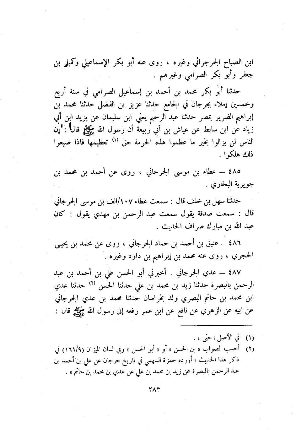 487- عَدِي الْجُرْجَانِي أَخْبَرَنِي أَبُو الْحَسَنِ عَلِيُّ بْنُ أَحْمَدَ بْنِ عَبْدِ الرَّحْمَنِ بِالْبَصْرَةِ حَدَّثَنَا زَيْدُ بْنُ مُحَمَّدِ بْنِ عَلِيٍّ حَدَّثَنَا الْحَسَنُ2 حَدَّثَنَا عَدِيُّ بْنُ مُحَمَّدِ بْنِ حَاتِمٍ الْبَصْرِيُّ وَلِدَ بِخُرَاسَانَ حَدَّثَنَا مُحَمَّدُ بْنُ عَدِيٍّ الْجُرْجَانِيُّ عَنْ أَبِيهِ عَنِ الزُّهْرِيِّ عَنْ نَافِعٍ عن بن عُمَرَ رَفَعَهُ إِلَى رَسُولِ اللَّهِ صَلَّى اللَّهُ عَلَيْهِ وَسَلَّمَ قَالَ:
