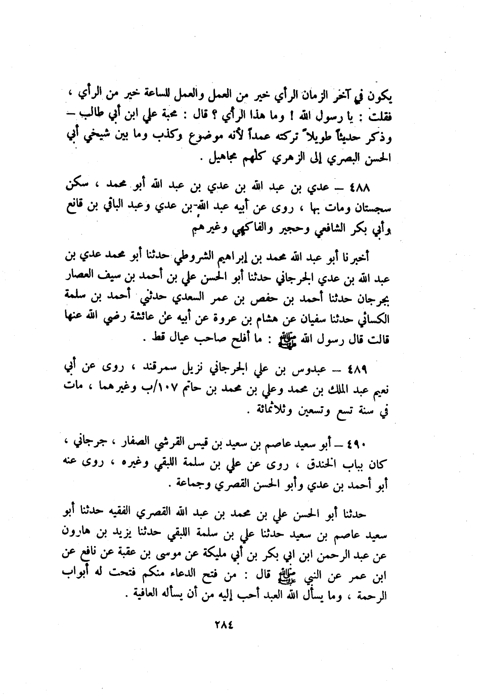 488 - عَدِي بْن عَبْد اللَّهِ بْن عدي بْنُ عَبْدِ اللَّهِ أَبُو مُحَمَّدٍ سكن سجستان وَمَاتَ بِهَا رَوَى عَنْ أَبِيهِ عَبْدِ اللَّهِ بْنِ عَدِي وعبد الباقي بْن قانع وأبي بَكْر الشَّافِعِي وحجير والفاكهي وغيرهم. أَخْبَرَنَا أَبُو عَبْدِ اللَّهِ مُحَمَّدُ بْنُ إِبْرَاهِيمَ الشُّرُوطِيُّ حَدَّثَنَا أَبُو مُحَمَّدٍ عَدِيُّ بْنُ عَبْدِ اللَّهِ بْنِ عَدِيٍّ الْجُرْجَانِيُّ حَدَّثَنَا أَبُو الْحَسَنِ عَلِيُّ بْنُ أَحْمَدَ بْنِ سَيْفٍ الْعَصَّارِ بِجُرْجَانَ حَدَّثَنَا أَحْمَدُ بْنُ حَفْصِ بْنِ عُمَرَ السَّعْدِيُّ حَدَّثَنِي أَحْمَدُ بْنُ سَلَمَةَ الْكِسَائِيُّ حَدَّثَنَا سُفْيَانُ عَنْ هِشَامِ بْنِ عُرْوَةَ عَنْ أَبِيهِ عَنْ عَائِشَةَ رَضِيَ اللَّهُ عَنْهَا قَالَتْ: قَالَ رَسُولُ اللَّهِ صَلَّى اللَّهُ عَلَيْهِ وَسَلَّمَ: "مَا أَفْلَحَ صَاحِبُ عِيَالٍ قَطُّ".