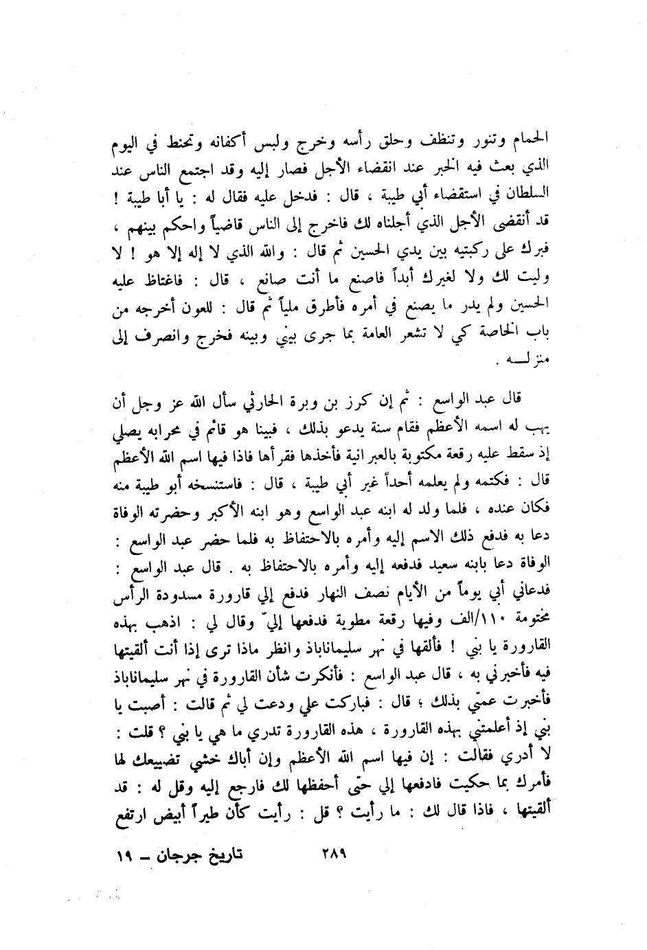 قَالَ عَبْد الواسع ثُمَّ إِن كرز بن وبرة الحارثي سأل اللَّه عز وجل أَن يهب لَهُ اسمه الأعظم فقام سَنَة يدعو بِذَلِكَ فبينا هُوَ قائم فِي محرابه يصلي إذ سقط عَلَيْهِ رقعة مكتوبة بالعبرانية فأخذها فقرأها فَإِذَا فِيهَا اسم اللَّه الأعظم قَالَ فكتمه وَلَمْ يعلمه أحدا غَيْر أَبِي طَيْبَةَ قَالَ فاستنسخه أَبُو طيبة منه فكان عنده فلما ولد لَهُ ابنه عَبْد الواسع وَهُوَ ابنه الأكبر وحضرته الوفاة دعا بِهِ فدفع ذَلِكَ الاسم إِلَيْهِ وأمره بالاحتفاظ بِهِ فلما حضر عَبْد الواسع الوفاة دعا بابنه سَعِيد فدفعه إِلَيْهِ وأمره بالاحتفاظ بِهِ قَالَ عَبْد الواسع فدعاني أَبِي يوما من الأيام نصف النهار فدفع إلي قارورة مسدودة الرأس مختومة 110/ألف وفيها رقعة مطوية فدفعها إلي وَقَالَ لي اذهب بِهَذِهِ القارورة يا بَنِي فألقها فِي نهر سُلَيْمَان اباذ وانظر ماذا ترى إِذَا أَنْتَ ألقيتها فِيهِ فأخبرني بِهِ قَالَ عَبْد الواسع: فأنكرت شأن القارورة فِي نهر سُلَيْمَان اباذ فأخبرت عمتي بِذَلِكَ قَالَ فباركت عَلِي ودعت لي ثُمَّ قَالَتْ أصبت يا بَنِي إذ أعلمتني بِهَذِهِ القارورة هذه القارورة تدري مَا هِيَ يا بَنِي قُلْت لا أدري فَقَالَتْ إِن فِيهَا اسم اللَّه الأعظم وإن أباك خشي تضييعك لَهَا فأمرك بِمَا حكيت فادفعها الي حَتَّى أحفظها لَكَ فارجع إِلَيْهِ وقل لَهُ قَدْ ألقيتها فَإِذَا قَالَ لَكَ مَا رَأَيْت قل رَأَيْت كأن طيرا أبيض ارتفع