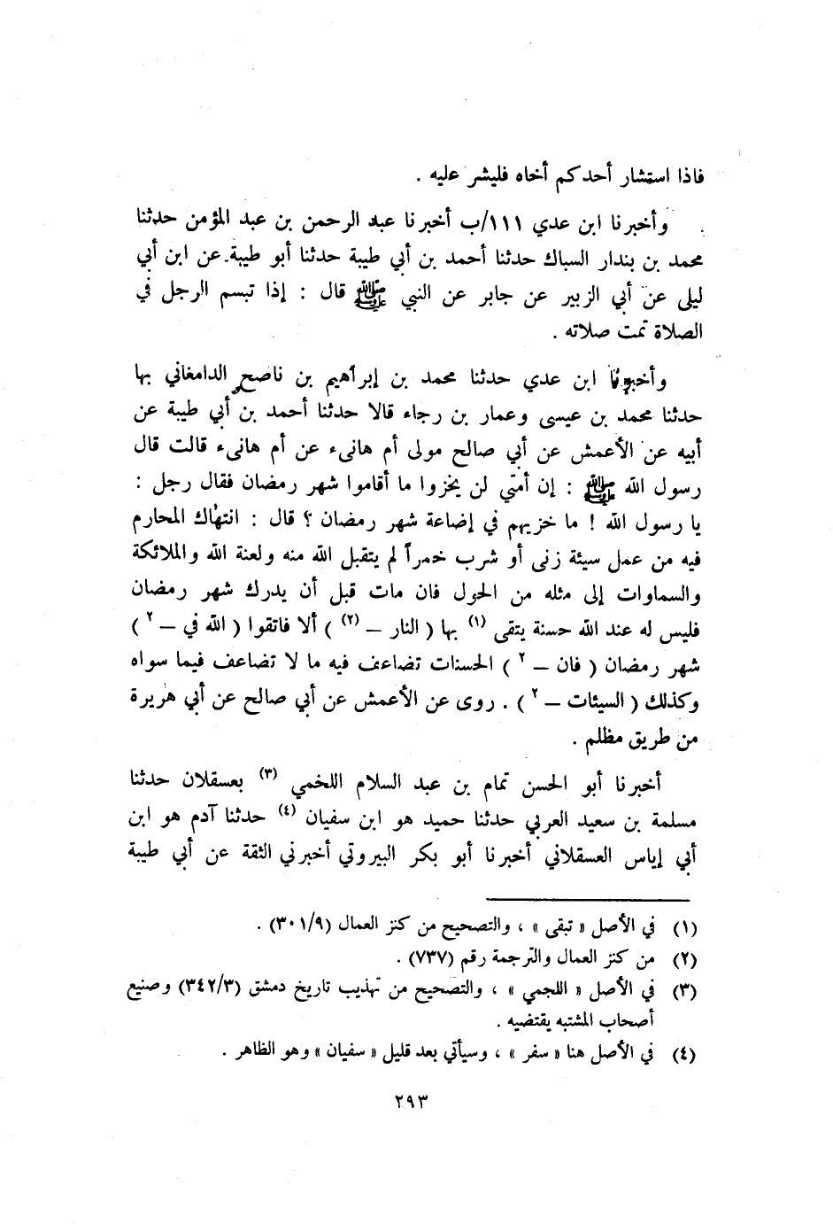 وأخبرنا بْنُ عَدِيٍّ حَدَّثَنَا مُحَمَّدُ بْنُ إِبْرَاهِيمَ بْنِ نَاصِحٍ الدَّامَغَانِيُّ بِهَا حَدَّثَنَا مُحَمَّدُ بْنُ عِيسَى وَعَمَّارُ بْنُ رَجَاءٍ قَالا حَدَّثَنَا أَحْمَدُ بْنُ أَبِي طَيْبَةَ عَنْ أَبِيهِ عَنِ الأَعْمَشِ عَنْ أَبِي صَالِحٍ مَوْلَى أُمِّ هَانِئٍ عَنْ أُمِّ هَانِئٍ قَالَتْ قَالَ رَسُولُ اللَّهِ صَلَّى اللَّهُ عَلَيْهِ وَسَلَّمَ: "أَنْ أُمَّتِي لَنْ يُخْزُوا مَا أَقَامُوا شَهْرَ رَمَضَانَ" فَقَالَ رَجُلٌ: يَا رَسُولَ اللَّهِ مَا خِزْيُهُمْ فِي إِضَاعَةِ شَهْرِ رَمَضَانَ قَالَ: "انْتِهَاكُ الْمَحَارِمِ فِيهِ مَنْ عَمِلَ سَيِّئَةً زَنَى أَوْ شَرِبَ خَمْرًا لَمْ يَتَقَبَّلِ اللَّهُ مِنْهُ وَلَعَنَةُ اللَّهِ والملائكة والسماوات إِلَى مِثْلِهِ مِنَ الْحَوْلِ فَإِنْ مَاتَ قَبْلَ أَنْ يُدْرِكَ شَهْرَ رَمَضَانَ فَلَيْسَ لَهُ عِنْدَ اللَّهِ حَسَنَةٌ يَتَّقِي1 بِهَا النَّارَ- 2 أَلا فَاتَّقُوا "اللَّهَ فِي – 2 شَهْرِ رَمَضَانَ فَإِنَّ- 2 الْحَسَنَاتِ تُضَاعَفُ فِيهِ مَا لا تُضَاعَفُ فِيمَا سِوَاهُ وَكَذَلِكَ السَّيِّئَاتِ – 2"رَوَى عَنِ الأَعْمَش عَنْ أَبِي صَالِحٍ عَنْ أَبِي هُرَيْرَةَ من طريق مظلم.