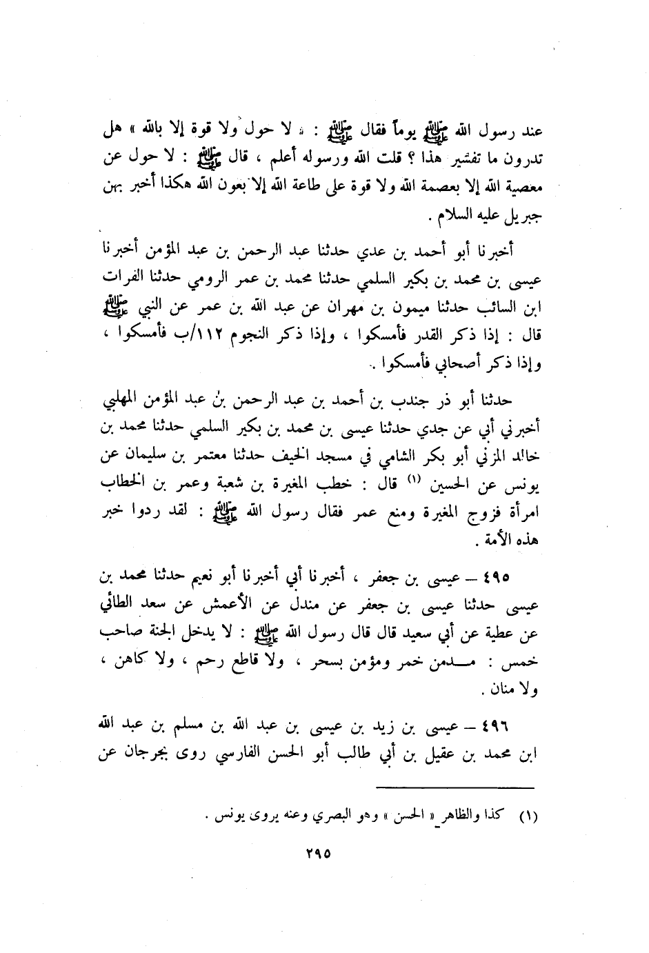495 - عِيسَى بْن جَعْفَر أَخْبَرَنَا أَبِي أَخْبَرَنَا أَبُو نعيم حَدَّثَنَا مُحَمَّدُ بْنُ عِيسَى حَدَّثَنَا عِيسَى بْن جَعْفَر عَنْ مندل عَنِ الأَعْمَش عَنْ سَعْد الطائي عَنْ عَطِيَّةَ عَنْ أَبِي سَعِيدٍ قَالَ: قَالَ رَسُولُ اللَّهِ صَلَّى اللَّهُ عَلَيْهِ وَسَلَّمَ: "لا يدخل الْجَنَّة صاحب خمس مدمن خمر ومؤمن بسحر ولا قاطع رحم ولا كاهن ولا منان".