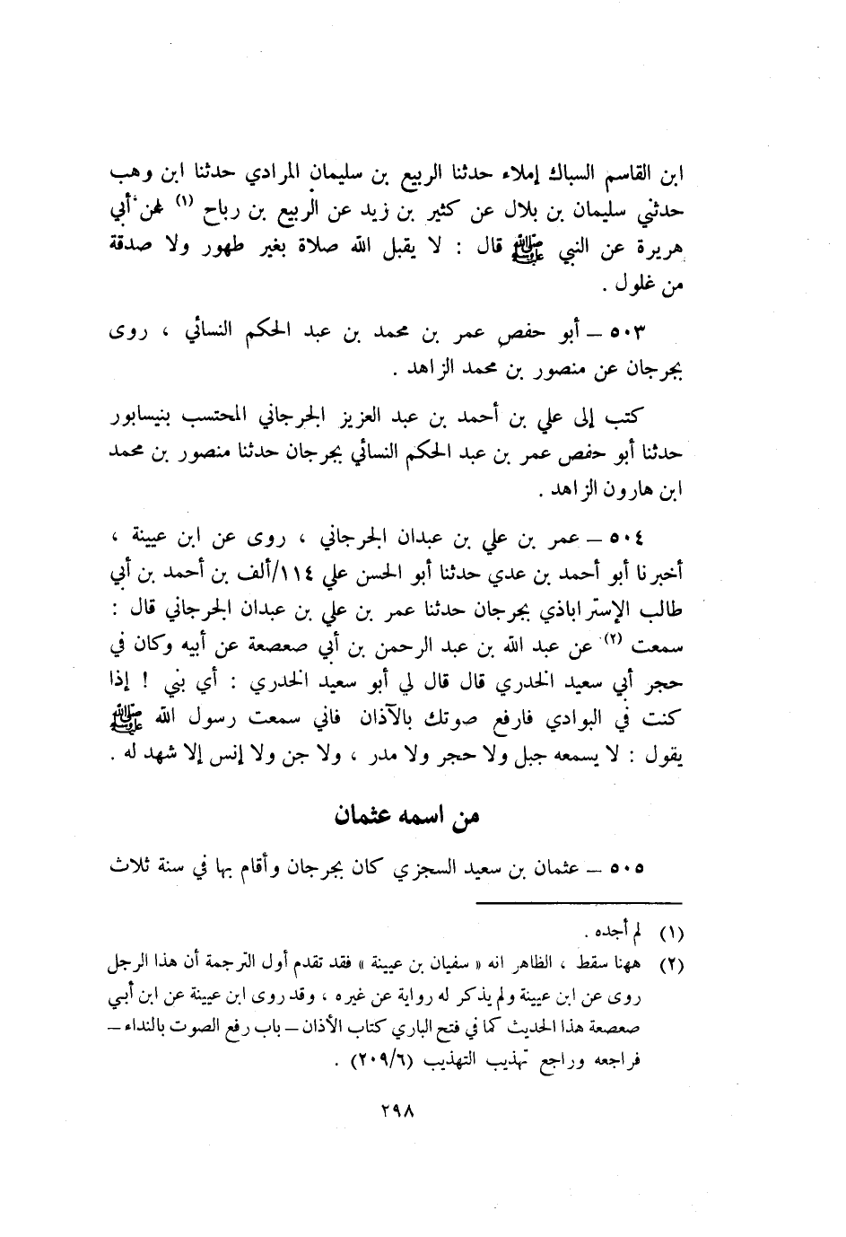 503 - أَبُو حفص عُمَر بْن مُحَمَّد بْن عَبْد الحكم النسائي رَوَى بِجُرْجَانَ عَنْ مَنْصُور بْن مُحَمَّد الزاهد كتب إِلَى عَلِي بْن أَحْمَدَ بْن عَبْد الْعَزِيز الْجُرْجَانِي المحتسب بنيسابور حَدَّثَنَا أَبُو حفص عُمَر بْن عَبْد الحكم النسائي بِجُرْجَانَ حَدَّثَنَا مَنْصُور بْن مُحَمَّد بْن هَارُون الزاهد