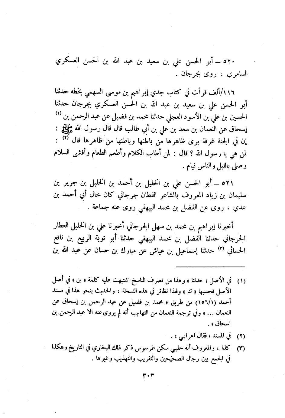 520 - أَبُو الْحَسَن عَلِيّ بْن سَعِيد بْن عَبْد اللَّهِ بْن الْحَسَن العسكري السامري رَوَى بجرجان. 116/ألف قرأت فِي كِتَاب جدي إبراهيم بْن مُوسَى السهمي بِخَطِّهِ حَدَّثَنَا أَبُو الْحَسَن عَلِيّ بْن سعيد بْن عَبْد اللَّهِ بْن الْحَسَن الْعَسْكَرِيُّ بِجُرْجَانَ حَدَّثَنَا الْحُسَيْنُ بْنُ عَلِيِّ بْنِ الأَسْوَدِ الْعِجْلِيُّ حَدَّثَنَا مُحَمَّدُ بْنُ فُضَيْلٍ عَنْ عَبْدِ الرَّحْمَنِ بْنِ1 إِسْحَاقَ عَنِ النُّعْمَانِ بن سعد بْن عَلِيّ بْن أَبِي طالب قَالَ: قَالَ رَسُولُ اللَّهِ صَلَّى اللَّهُ عَلَيْهِ وَسَلَّمَ: "إِنَّ فِي الْجَنَّةِ غُرْفَةً يُرَى ظَاهِرُهَا مِنْ بَاطِنُهَا وَبَاطِنُهَا مِنْ ظَاهِرِهَا" قَالَ2 لِمَنْ هِيَ يَا رَسُولَ اللَّهِ؟ قَالَ: "لِمَنْ أَطَابَ الْكَلامَ وَأَطْعَمَ الطَّعَامَ وَأَفْشَى السَّلامَ وَصَلَّى بِاللَّيْلِ وَالنَّاسُ نِيَامٌ".