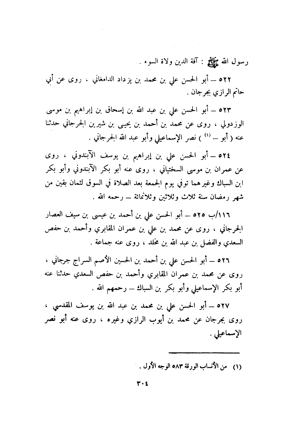 527- أَبُو الْحَسَن عَلِيُّ بْنُ مُحَمَّدِ بْنِ عَبْدِ اللَّهِ بْن يُوسُف المقدسي رَوَى بِجُرْجَانَ عَنْ مُحَمَّد بْن أيوب الرَّازِيّ وغيره رَوَى عَنْهُ أَبُو نصر الإسماعيلي.