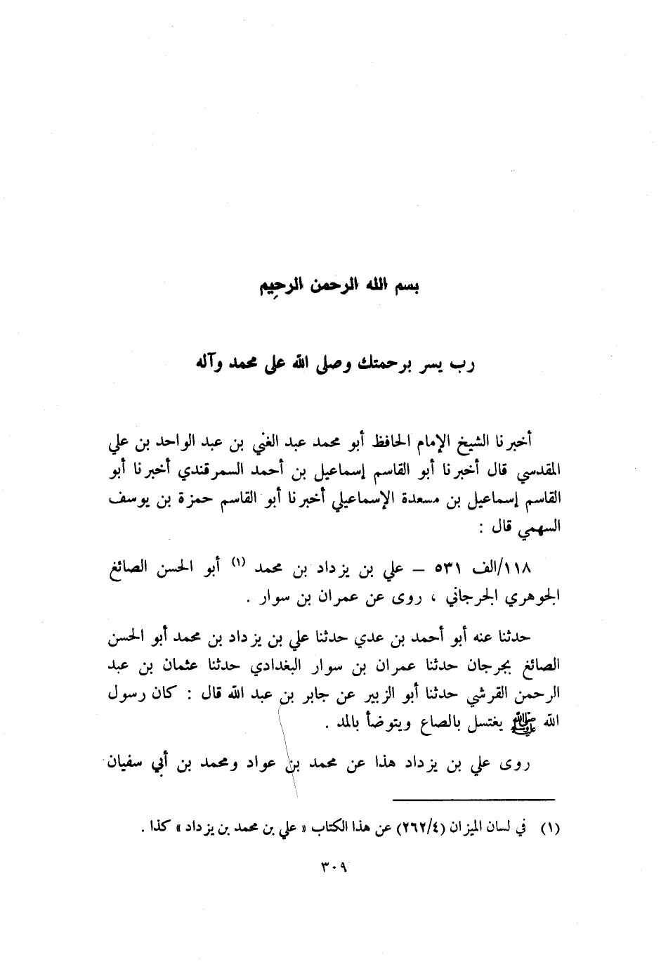أخبرنا الشيخ الإمام الحافظ أبو محمد عبد الغني بن عبد الواحد بن علي المقدسي قال أخبرنا أَبُو الْقَاسِمِ إِسْمَاعِيلُ بْنُ أَحْمَدَ السمرقندي أخبرنا أبو القاسم إسماعيل بن مسعدة الإسماعيلي أخبرنا أبو القاسم حمزة بن يوسف السهمي قال:
