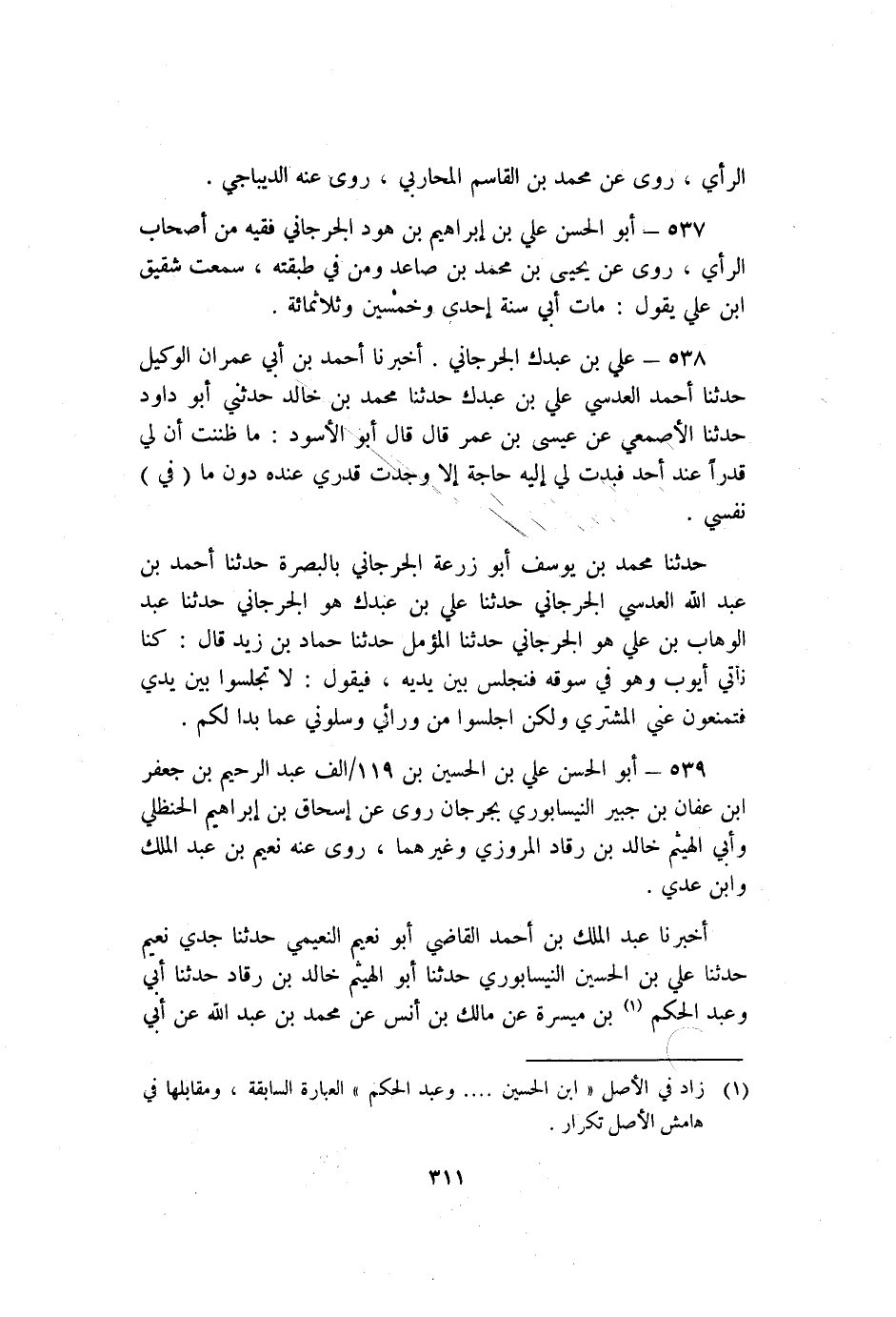539- أَبُو الْحَسَن عَلِي بْن الْحُسَيْن بن 119/ألف عَبْد الرحيم بْن جَعْفَر بْن عَفَّان بْن جُبَيْر النَّيْسَابُورِي بِجُرْجَانَ روى عَنْ إسحاق بْن إبراهيم الحنظلي وأبي الهيثم خَالِد بْن رقاد الْمَرْوَزِي وغيرهما رَوَى عَنْهُ نعيم بْن عَبْد الملك وابن عَدِي.