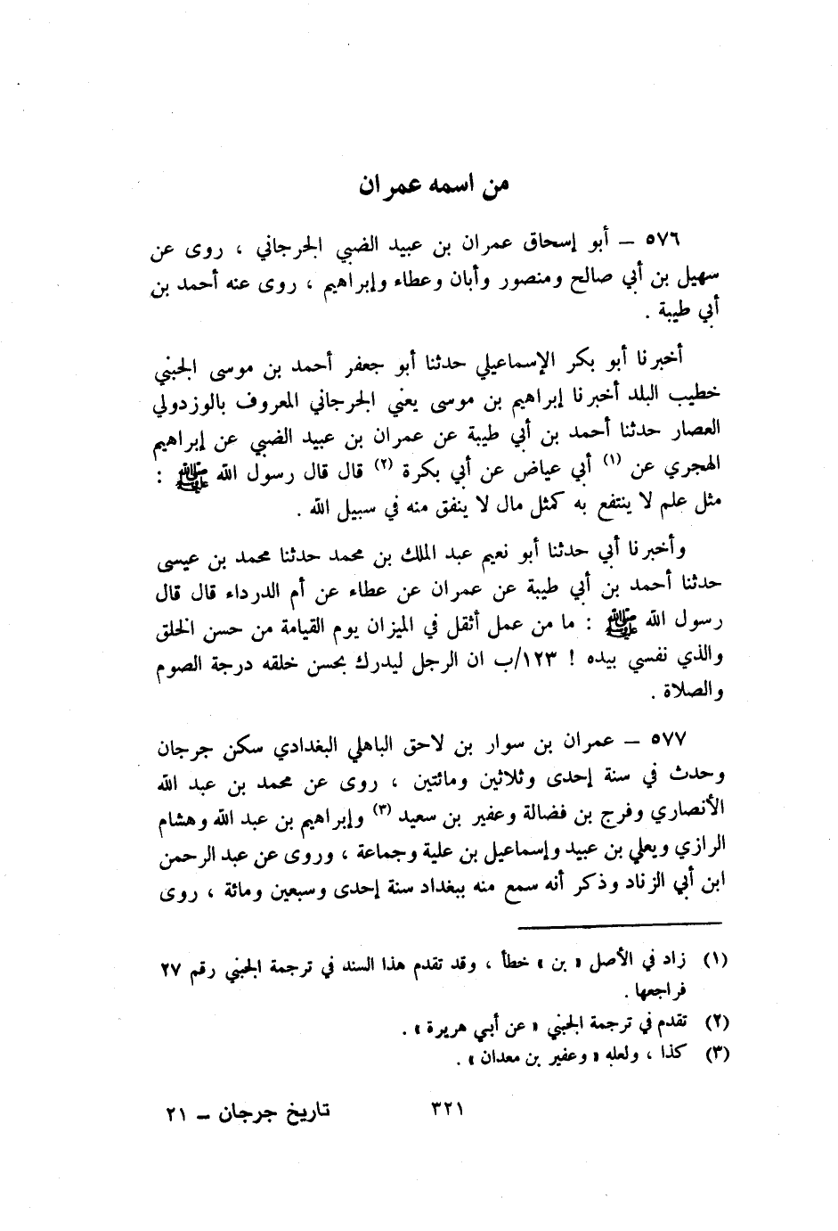577 - عِمْرَان بْن سوار بْن لاحق الْبَاهِلِي الْبَغْدَادِي سكن جُرْجَان وحدث فِي سَنَة إحدى وثلاثين ومائتين رَوَى عَنْ مُحَمَّد بْن عَبْد اللَّهِ الأنصاري وفرج بْن فضالة وعفير بْن سَعِيد3 وإبراهيم بْن عَبْد اللَّهِ وَهِشَام الرَّازِيّ ويعلي بْن عبيد وإسماعيل بْن علية وجماعة وَرَوَى عَنْ عَبْد الرَّحْمَنِ بْن أَبِي الزناد وذكر أَنَّهُ سمع منه بِبَغْدَادَ سَنَة إحدى وسبعين ومائة روى