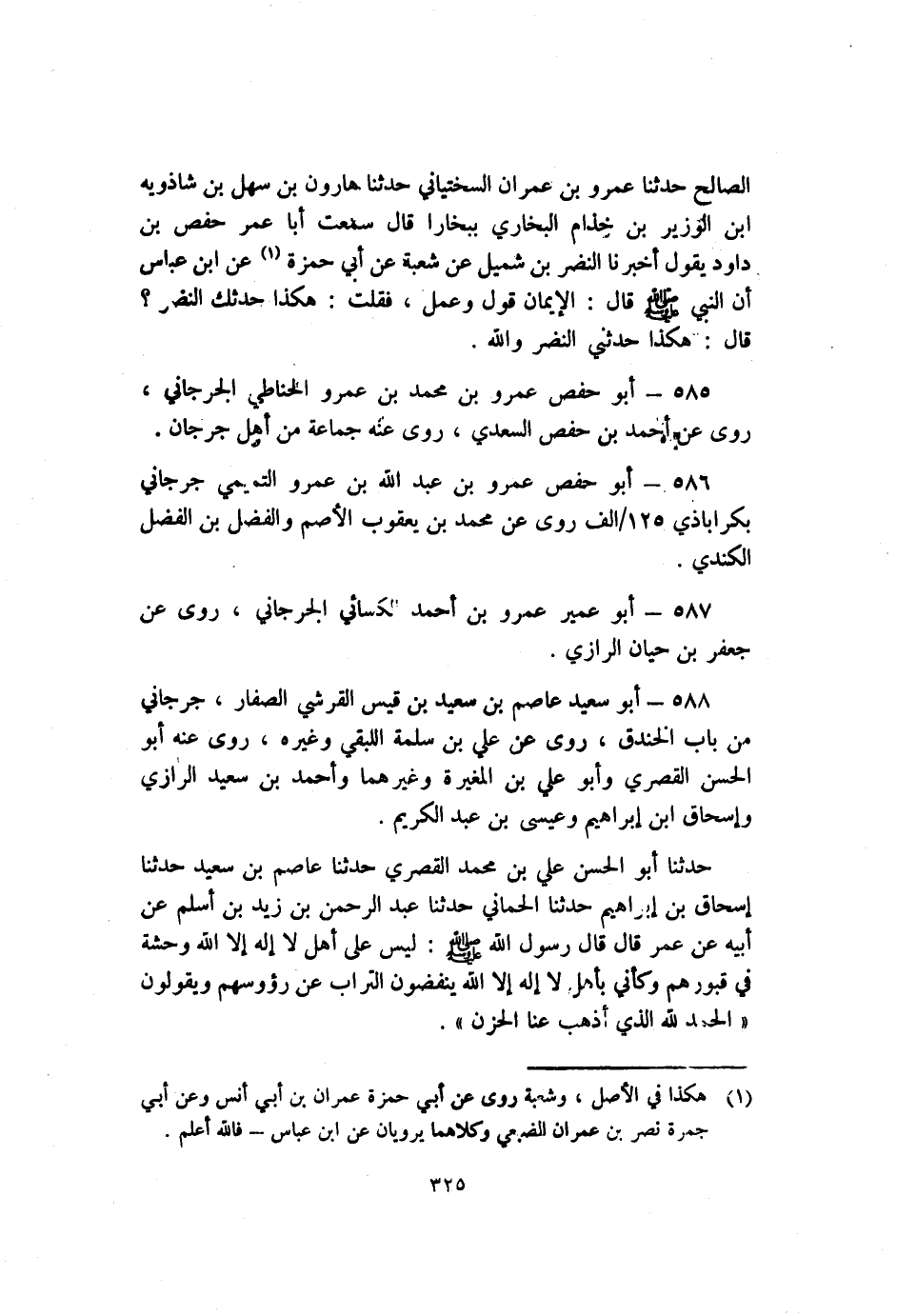 586 - أَبُو حفص عَمْرو بْن عَبْد اللَّهِ بْن عَمْرو التميمي جرجاني بكرآباذي 125/ألف رَوَى عَنْ مُحَمَّد بْن يَعْقُوب الأصم والفضل بْن الفضل الكندي.