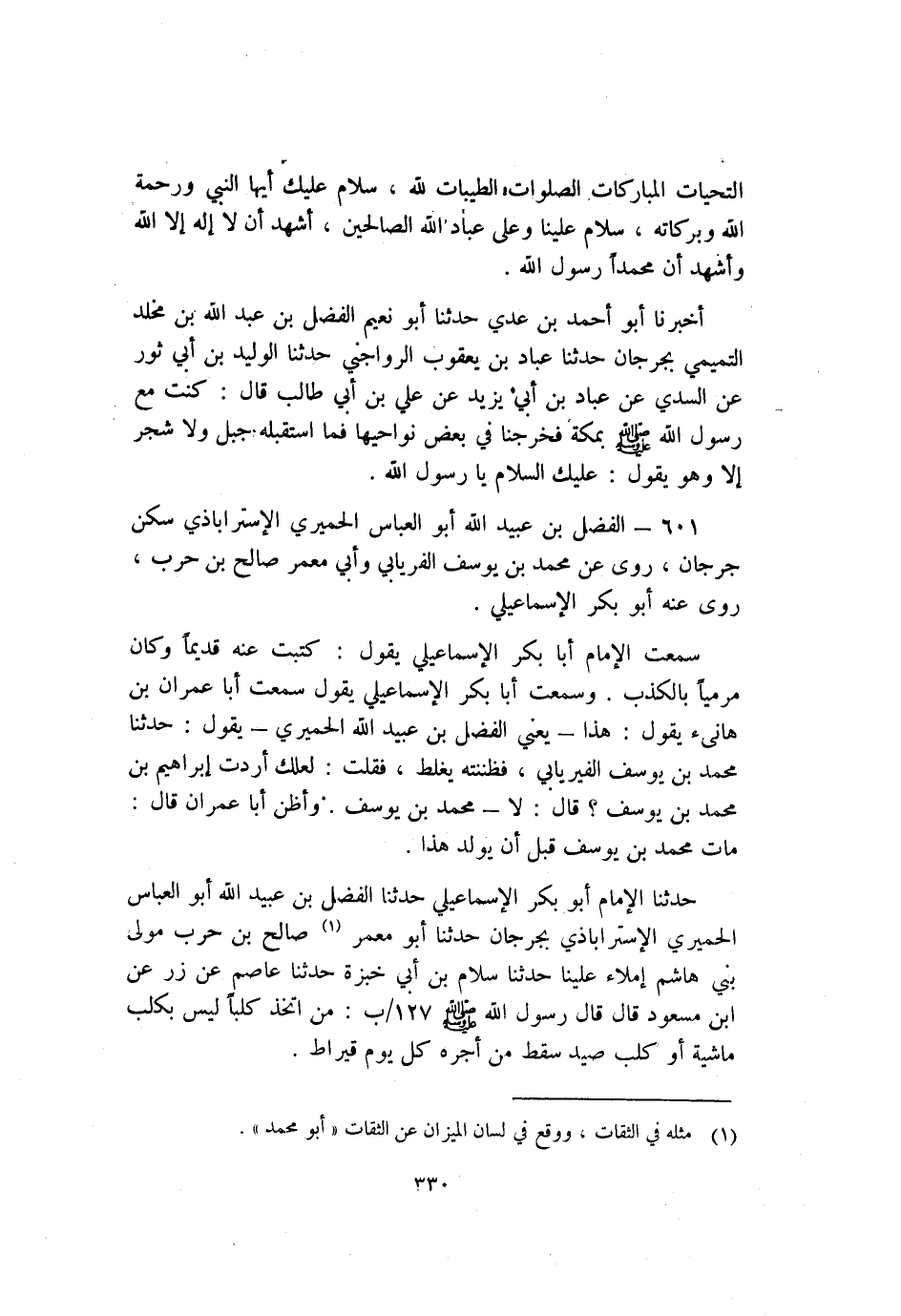 601 - الفضل بْن عُبَيْد اللَّهِ أَبُو الْعَبَّاس الحميري الإِسْتَرَابَاذِي سكن جُرْجَان رَوَى عَنْ مُحَمَّد بْن يُوسُف الفريابي وأبي مَعْمَر صَالِح بْن حرب روى عنه أَبُو بكر الإسماعيلي.