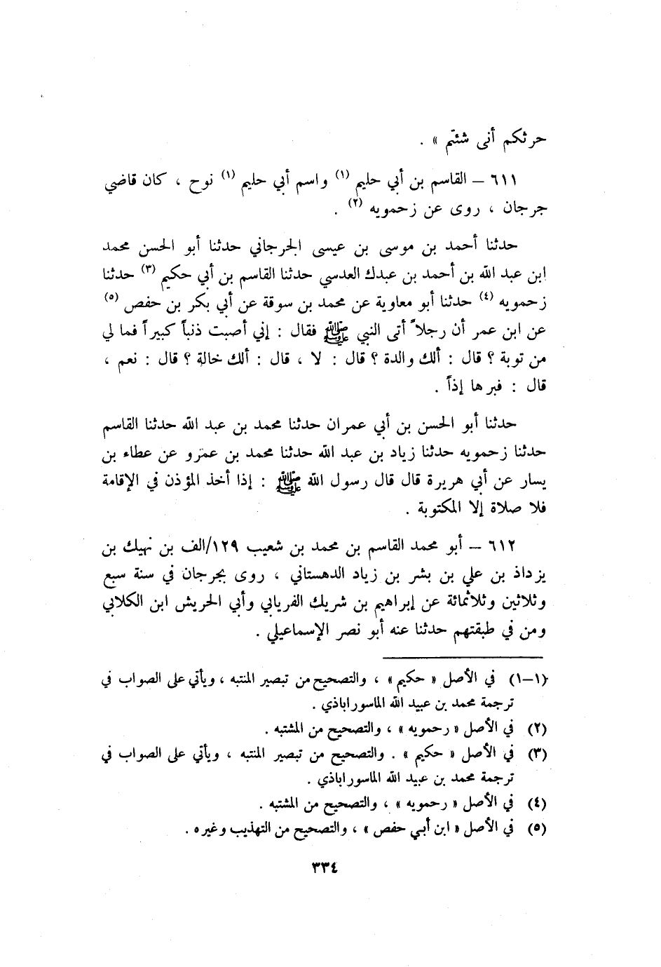 611 - الْقَاسِم بْن أَبِي حليم1 واسم أَبِي حليم1 نوح كَانَ قَاضِي جُرْجَان رَوَى عَنْ زحمويه2. حَدَّثَنَا أَحْمَدُ بْن مُوسَى بْن عيسى الْجُرْجَانِيّ حَدَّثَنَا أَبُو الْحَسَنِ مُحَمَّدُ بْنُ عَبْدُ اللَّهِ بْنُ أَحْمَدَ بْنِ عَبْدَكَ الْعُدُسِيُّ حَدَّثَنَا الْقَاسِمُ بْنُ أَبِي حَكِيمٍ3 حَدَّثَنَا زَحْمَوَيْهِ4 حَدَّثَنَا أَبُو مُعَاوِيَةَ عَنْ مُحَمَّدِ بْنِ سَوْقَةَ عَنْ أَبِي بَكْرِ بْنِ حفص5 عن بن عُمَرَ أَنَّ رَجُلا أَتَى النَّبِيَّ صَلَّى اللَّهُ عَلَيْهِ وَسَلَّمَ فَقَالَ: إِنِّي أَصَبْتُ ذَنْبًا كَبِيرًا فَمَالِي مِنْ تَوْبَةٍ؟ قَالَ: "أَلَكَ وَالِدَةٌ"؟ قَالَ: لا, قَالَ: "أَلَكَ خَالَةٌ"؟ قَالَ: نَعَمْ قَالَ: "فَبِرَّهَا إِذًا".