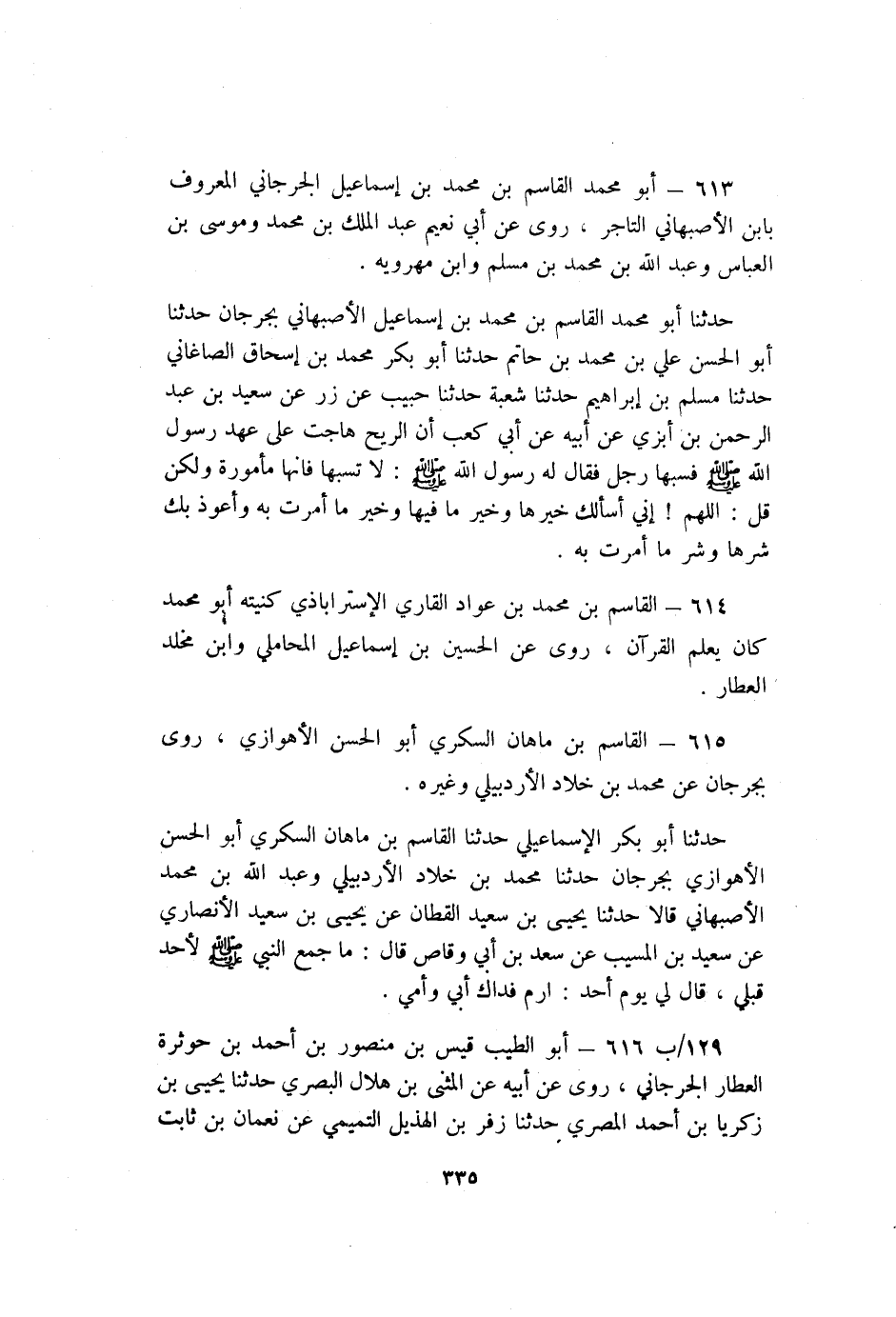 613 - أَبُو مُحَمَّد الْقَاسِم بْن مُحَمَّد بْن إِسْمَاعِيل الْجُرْجَانِي المعروف بابن الأصبهاني التاجر رَوَى عَنْ أَبِي نُعَيْمٍ عَبْدُ الْمَلِكِ بْنُ مُحَمَّدِ وموسى بْن العباس وعبد اللَّه بْن مُحَمَّد بْن مسلم وابن مهرويه.
