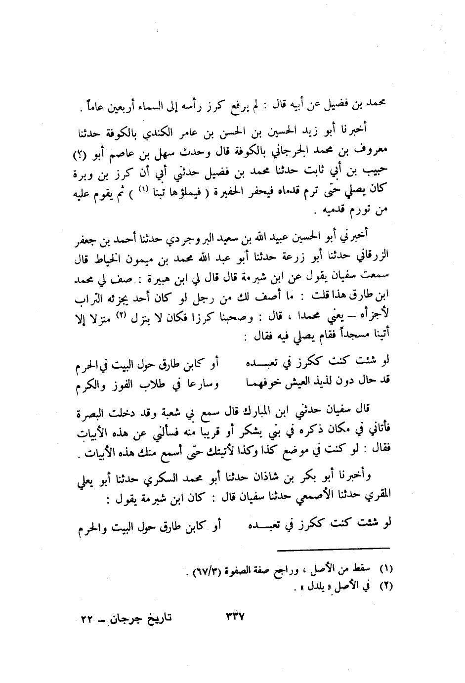 أَخْبَرَنَا أَبُو زَيْدٍ الْحُسَيْنُ بْنُ الْحَسَنِ بْنُ عَامِرٍ الْكِنْدِيُّ بِالْكُوفَةِ حَدَّثَنَا معروف بْن مُحَمَّد الْجُرْجَانِي بالكوفة قَالَ وحدث سهل بْن عَاصِم أَبُو حبيب بْن أَبِي ثابت حَدَّثَنَا مُحَمَّد بْن فضيل حَدَّثَنِي أَبِي أَن كرز بْن وبرة كَانَ يصلي حَتَّى ترم قدماه فيحفر الحفيرة "فيملؤها تبنا"1 ثُمَّ يقوم عَلَيْهِ من تورم قدميه.