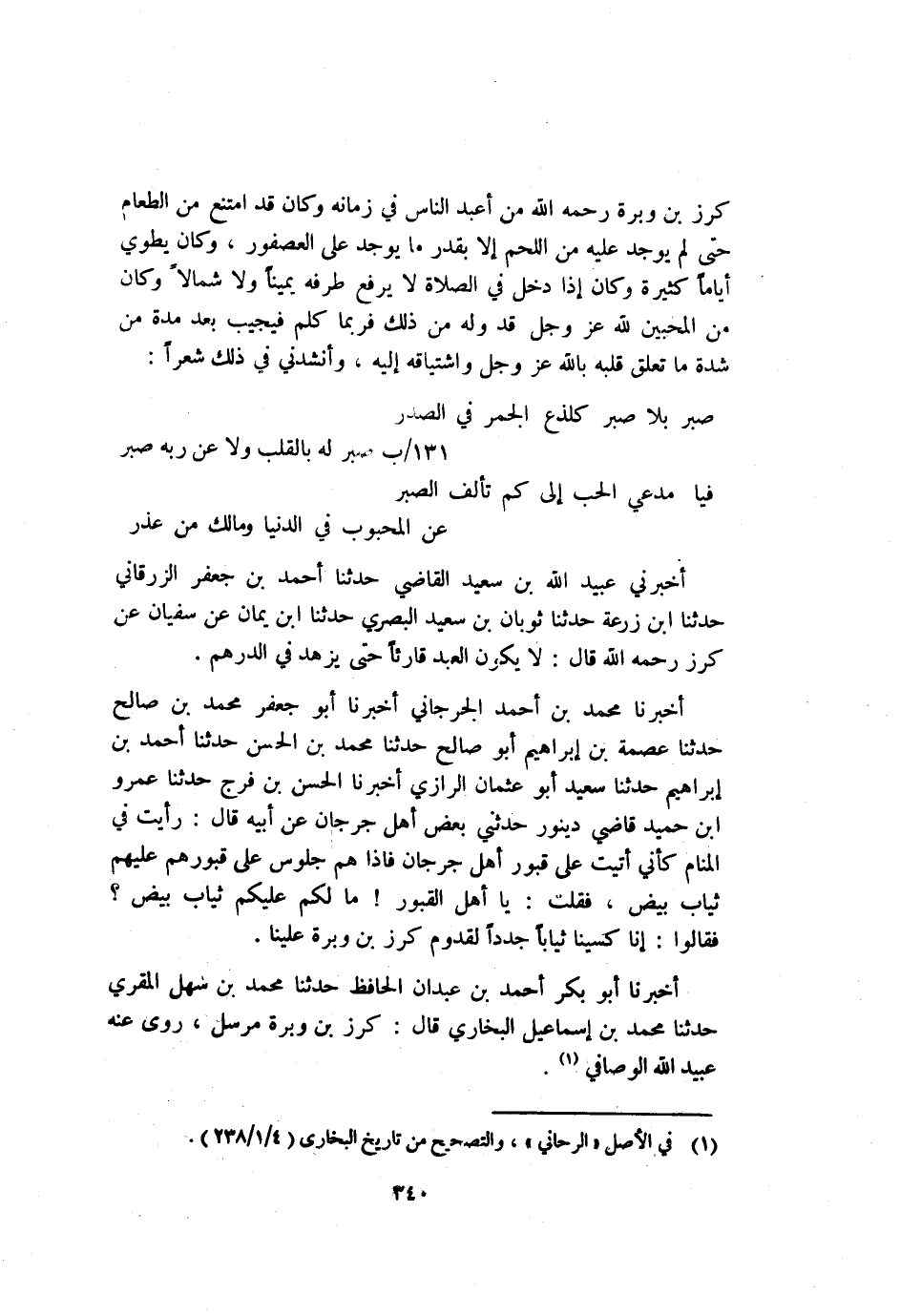 أخبرنا أَبُو بكر أَحْمَد بْن عبدان الحافظ حَدَّثَنَا مُحَمَّد بْن سهل المقري حَدَّثَنَا مُحَمَّد بْن إِسْمَاعِيلَ الْبُخَارِيُّ قَالَ كَرْزُ بْنُ وَبَرَةَ مرسل رَوَى عَنْهُ عُبَيْد الله الوصافي1.
