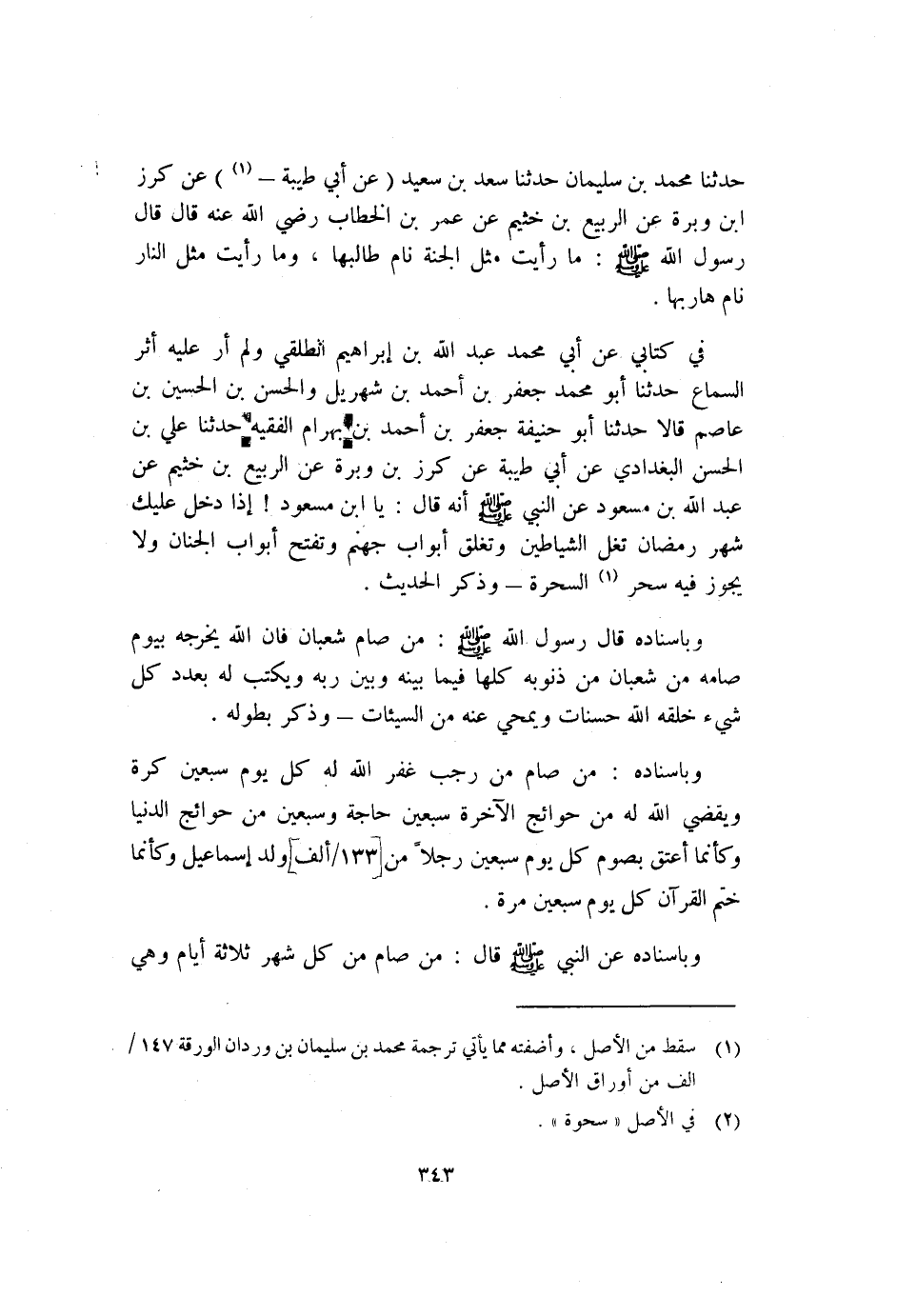 فِي كتابي عَنْ أَبِي مُحَمَّد عَبْد اللَّهِ بْن إِبْرَاهِيم الطلقي وَلَمْ أر عَلَيْهِ أثر السماع حَدَّثَنَا أَبُو مُحَمَّدٍ جَعْفَرُ بْنُ أَحْمَدَ بْنِ شهريلَ وَالْحَسَنُ بْنُ الْحُسَيْنِ بْنِ عَاصِمٍ قَالا حَدَّثَنَا أَبُو حَنِيفَةَ جَعْفَرُ بْنُ أَحْمَدَ بْنِ بَهْرَامَ الْفَقِيهُ حَدَّثَنَا عَلِيُّ بْنُ الْحَسَنِ الْبَغْدَادِيُّ عَنْ أَبِي طَيْبَةَ عَنْ كُرْزِ بْنِ وَبْرَةَ عَنِ الرَّبِيعِ بْنِ خُثَيْمٍ عَنْ عَبْدِ اللَّهِ بْنِ مَسْعُودٍ عَن ِالنَّبِيِّ صَلَّى اللَّهُ عَلَيْهِ وَسَلَّمَ أَنَّهُ قَالَ: "يَا ابْنَ مَسْعُودٍ إِذَا دَخَلَ عَلَيْكَ شَهْرُ رَمَضَانَ تُغَلُّ الشَّيَاطِينُ وَتُغْلَقُ أَبْوَابُ جَهَنَّمَ وَتُفْتَحُ أَبْوَابُ الْجِنَانِ وَلا يَجُوزُ فِيهِ سِحْرُ 2 السَّحَرَةِ" وذكر الْحَدِيث.
