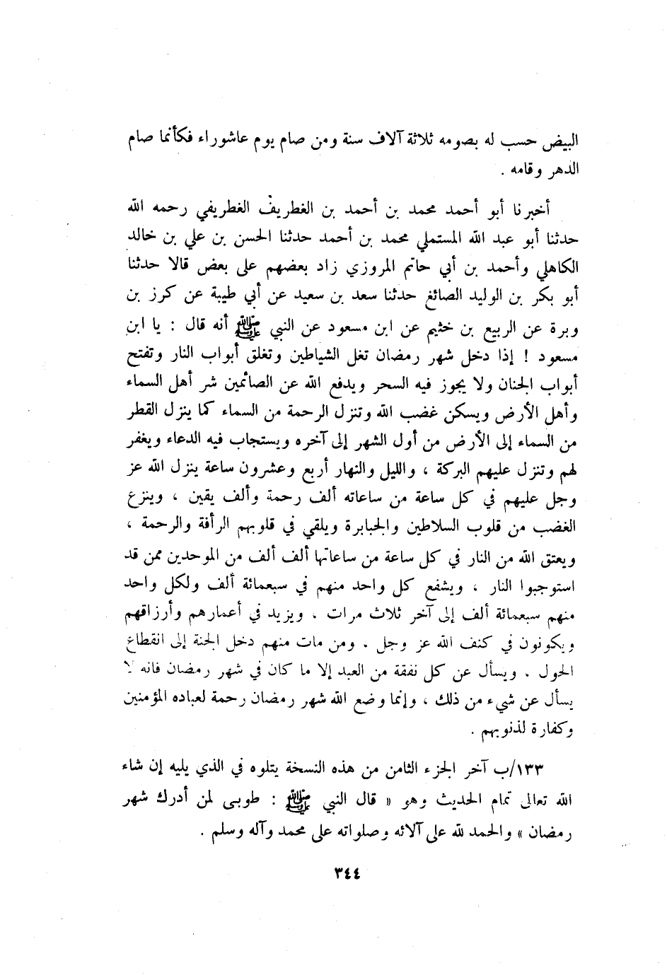 الْبِيضُ حُسِبَ لَهُ بِصَوْمِهِ ثَلاثَةُ آَلافِ سَنَةٍ وَمَنْ صَامَ يَوْمَ عَاشُورَاءَ فَكَأَنَّمَا صَامَ الدَّهْرَ وَقَامَهُ". أَخَبْرَنَا أَبُو أَحْمَدَ مُحَمَّدُ بْنُ أحمد بن الغطريف الغطريفي رَحِمَهُ اللَّهُ حَدَّثَنَا أَبُو عَبْدِ اللَّهِ الْمُسْتَمِلِيُّ مُحَمَّدُ بْنُ أَحْمَدَ حَدَّثَنَا الْحَسَنُ بْنُ عَلِيِّ بْنِ خَالِدٍ الْكَاهِلِيُّ وَأَحْمَدُ بْنُ أَبِي حَاتِمٍ الْمَرْوَزِيُّ زَادَ بَعْضُهُمْ عَلَى بَعْضٍ قَالا حَدَّثَنَا أَبُو بَكْرِ بْنِ الْوَلِيدِ الصَّائِغُ حَدَّثَنَا سَعْدُ بْنُ سَعِيدٍ عَنْ أَبِي طَيْبَةَ عَنْ كُرْزِ بْنِ وَبْرَةَ عَنِ الربيع بن خثيم عن بْنِ مَسْعُودٍ عَن ِالنَّبِيِّ صَلَّى اللَّهُ عَلَيْهِ وَسَلَّمَ أَنَّهُ قَالَ: "يَا ابْنَ مَسْعُودٍ إِذَا دَخَلَ شَهْرُ رَمَضَانَ تُغَلُّ الشَّيَاطِينُ وَتُغْلَقُ أَبْوَابُ النَّارِ وَتُفْتَحُ أَبْوَابُ الْجِنَانِ وَلا يَجُوزُ فِيهِ السِّحْرُ وَيَدْفَعُ اللَّهُ عَنِ الصَّائِمِينَ شَرَّ أَهْلِ السَّمَاءِ وَأَهْلِ الأَرْضِ وَيَسْكُنُ غَضَبُ اللَّهِ وَتَنْزِلُ الرَّحْمَةُ مِنَ السَّمَاءِ كَمَا يَنْزِلُ الْقَطْرُ مِنَ السَّمَاءِ إِلَى الأَرْضِ مِنْ أَوَّلِ الشَّهْرِ إِلَى آَخِرِهِ وَيُسْتَجَابُ فِيهِ الدُّعَاءُ وَيُغْفَرُ لَهُمْ وَتُنَزَّلُ عَلَيْهِمُ الْبَرَكَةُ وَاللَّيْلُ وَالنَّهَارُ أَرْبَعٌ وَعِشْرُونَ سَاعَةً يُنْزِلُ اللَّهُ عَزَّ وَجَلَّ عَلَيْهِمْ فِي كُلِّ سَاعَةٍ مِنْ سَاعَاتِهِ أَلْفَ رَحْمَةٍ وَأَلْفَ يَقِينٍ وَيَنْزَعُ الْغَضَبَ مِنْ قُلُوبِ السَّلاطِينِ وَالْجَبَابِرَةِ وَيُلْقِي فِي قُلُوبِهِمُ الرَّأْفَةَ وَالرَّحْمَةَ وَيَعْتِقُ اللَّهُ مِنَ النَّارِ فِي كُلِّ سَاعَةٍ مِنْ سَاعَاتِهَا أَلْفَ أَلْفٍ مِنَ الْمُوَحِّدِينَ مِمَّن قَدِ اسَتَوْجَبُوا النَّارَ وَيُشَفِّعُ كُلُّ وَاحِدٍ مِنْهُم فِي سَبْعُمَائَةِ أَلْفٍ وَلُكُلِّ وَاحِدٍ مِنْهُمْ سَبْعُمَائَةُ أَلْفٍ إِلَى آَخِرِ ثَلاثِ مَرَّاتٍ وَيُزِيدُ فِي أَعْمَارِهِمْ وَأَرْزَاقِهِمْ وَيَكُونُونَ فِي كَنَفِ اللَّهِ عَزَّ وَجَلَّ وَمَنْ مَاتَ مِنْهُمْ دَخَلَ الْجَنَّةَ إِلَى انْقِطَاعِ الْحَوْلِ وَيُسْأَلُ عَنْ كُلِّ نَفَقَةٍ مِنَ الْعَبْدِ إِلاَّ مَا كَانَ فِي شَهْرِ رَمَضَانَ فَإِنَّهُ لا يُسْأَلُ عَنْ شَيْءٍ مِنْ ذَلِكَ وَإِنَّمَا وَضَعَ اللَّهُ شَهْرَ رَمَضَانَ رَحْمَةً لِعِبَادِهِ الْمُؤْمِنيِنَ وَكَفَّارَةً لِذُنُوبِهِمْ".