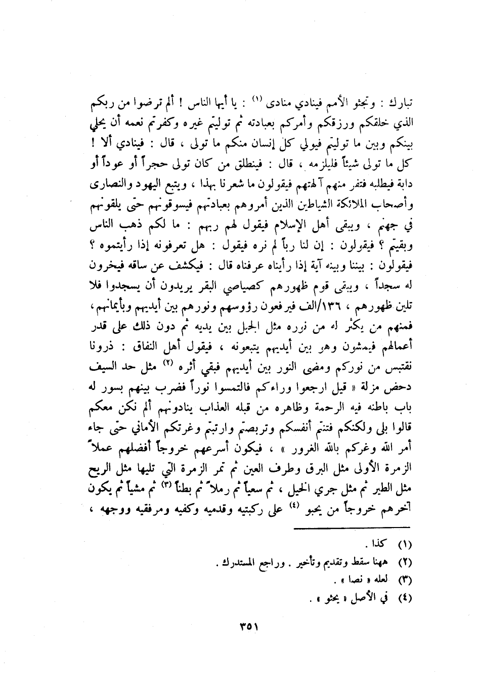 تبارك: وتجثو الأمم فينادي منادى: 1 يَا أَيُّها النَّاسُ أَلَمْ تَرْضُوا مِنْ رَبِّكُمُ الَّذِي خَلَقَكُمْ وَرَزَقَكُمْ وَأَمَرَكُمْ بِعِبَادَتِهِ ثُمَّ تَوَلَّيْتُمْ غَيْرَهُ وكفرتم نعمه أن يحلي بَيْنَكُمْ وَبَيْنَ مَا تَوَلَّيْتُمْ فَيُوَلِّي كُلَّ إِنْسَانٍ مِنْكُمْ مَا تَوَلَّى قَالَ: فَيُنَادِي أَلا كُلُّ مَا تَوَلَّى شَيْئًا فَلْيَلْزَمْهُ قَالَ: فَيَنْطِقُ مَنْ كَانَ تَوَلَّى حَجَرًا أَوْ عُودًا أَوْ دَابَّةً فَيَطْلُبُهُ فَتَفِرُّ مِنْهُمْ آَلِهَتُهُمْ فَيَقُولُونَ: مَا شَعَرْنَا بِهَذَا وَيَّتَبِعُ الْيَهُودُ وَالنَّصَارَى وَأَصْحَابُ الْمَلائِكَةُ الشَّيَاطِينَ الَّذِينَ أَمَرُوهُمْ بِعِبَادَتِهِمْ فَيَسُوقُونَهُمْ حَتَّى يَلْقُونَهُمْ فِي جَهَنَّمَ وَيَبْقَى أَهْلُ الإِسْلامِ فَيَقُولُ لَهُمْ رَبُّهُمْ: مَا لَكُمْ ذَهَبَ النَّاسُ وَبَقَيْتُمْ؟ فَيَقُولُونَ: إِنَّ لَنَا رَبًّا لَمْ نَرَهُ فَيَقُولُ: هَلْ تَعْرِفُونَهُ إِذَا رَأَيْتُمُوهُ؟ فَيَقُولُونَ: بَيْنَنَا وَبَيْنَهُ آَيَةٌ إِذَا رَأَيْنَاهُ عَرَفْنَاهُ قَالَ: فَيَكْشِفُ عَنْ سَاقِهِ فَيَخِرُّونَ لَهُ سُجَّدًا وَيَبْقَى قَوْمٌ ظُهُورُهُمْ كَصَيَاصِي الْبَقَرِ يُرِيدُونَ أَنْ يَسْجُدُوا فَلا تلين ظهورهم 136/ألف فَيَرْفَعُونَ رُؤُوسَهُمْ وَنُورُهُمْ بَيْنَ أَيْدِيهِمْ وَبِأَيْمَانِهِمْ فَمِنْهُمْ مَنْ يُكْثَرُ لَهُ نُورِهِ مِثْلَ الْجَبَلِ بَيْنَ يَدَيْهِ ثُمَّ دُونَ ذَلِكَ عَلَى قَدْرِ أَعْمَالِهِمْ فَيَمْشُونَ وَهُوَ بَيْنَ أَيْدِيهِمْ يَتَّبِعُونَهُ فَيَقُولُ أَهْلُ النِّفَاقِ ذَرُونَا نَقْتَبِسُ مِنْ نُورِكُمْ وَمَضَى النُّورُ بَيْنَ أَيْدِيهِمْ فَبَقِيَ أَثَرُهُ 2 مِثْلَ حَدِّ السَيْفِ دَحْضٍ مَزِلَّةٍ قِيلَ: {قِيلَ ارْجِعُوا وَرَاءَكُمْ فَالْتَمِسُوا نُوراً فَضُرِبَ بَيْنَهُمْ بِسُورٍ لَهُ بَابٌ بَاطِنُهُ فِيهِ الرَّحْمَةُ وَظَاهِرُهُ مِنْ قِبَلِهِ الْعَذَابُ يُنَادُونَهُمْ أَلَمْ نَكُنْ مَعَكُمْ قَالُوا بَلَى وَلَكِنَّكُمْ فَتَنْتُمْ أَنْفُسَكُمْ وَتَرَبَّصْتُمْ وَارْتَبْتُمْ وَغَرَّتْكُمُ الْأَمَانِيُّ حَتَّى جَاءَ أَمْرُ اللَّهِ وَغَرَّكُمْ بِاللَّهِ الْغَرُورُ} [الحديد:14] فَيَكُونُ أَسْرَعُهُمْ خُرُوجًا أَفْضَلَهُمْ عَمَلا الزُّمْرَةُ الأُولَى مِثْلُ الْبَرْقِ وَطَرْفِ الْعَيْنِ ثُمَّ تَمُرُّ الزُّمْرَةُ الَّتِي تَلِيهَا مِثْلَ الرِّيحِ مِثْلَ الطَّيْرِ ثُمَّ مِثْلَ جَرْي الْخَيْلِ ثُمَّ سَعْيًا ثُمَّ رَمَلا ثُمَّ بَطَنًا 3 ثُمَّ مَشْيًا ثُمَّ يَكُونُ آَخِرُهُمْ خُرُوجًا مَنْ يَحْبُو4 عَلَى رُكْبَتَيْهِ وَقَدَمَيْه وَكَفَّيْهِ ومرفقيه ووجهه