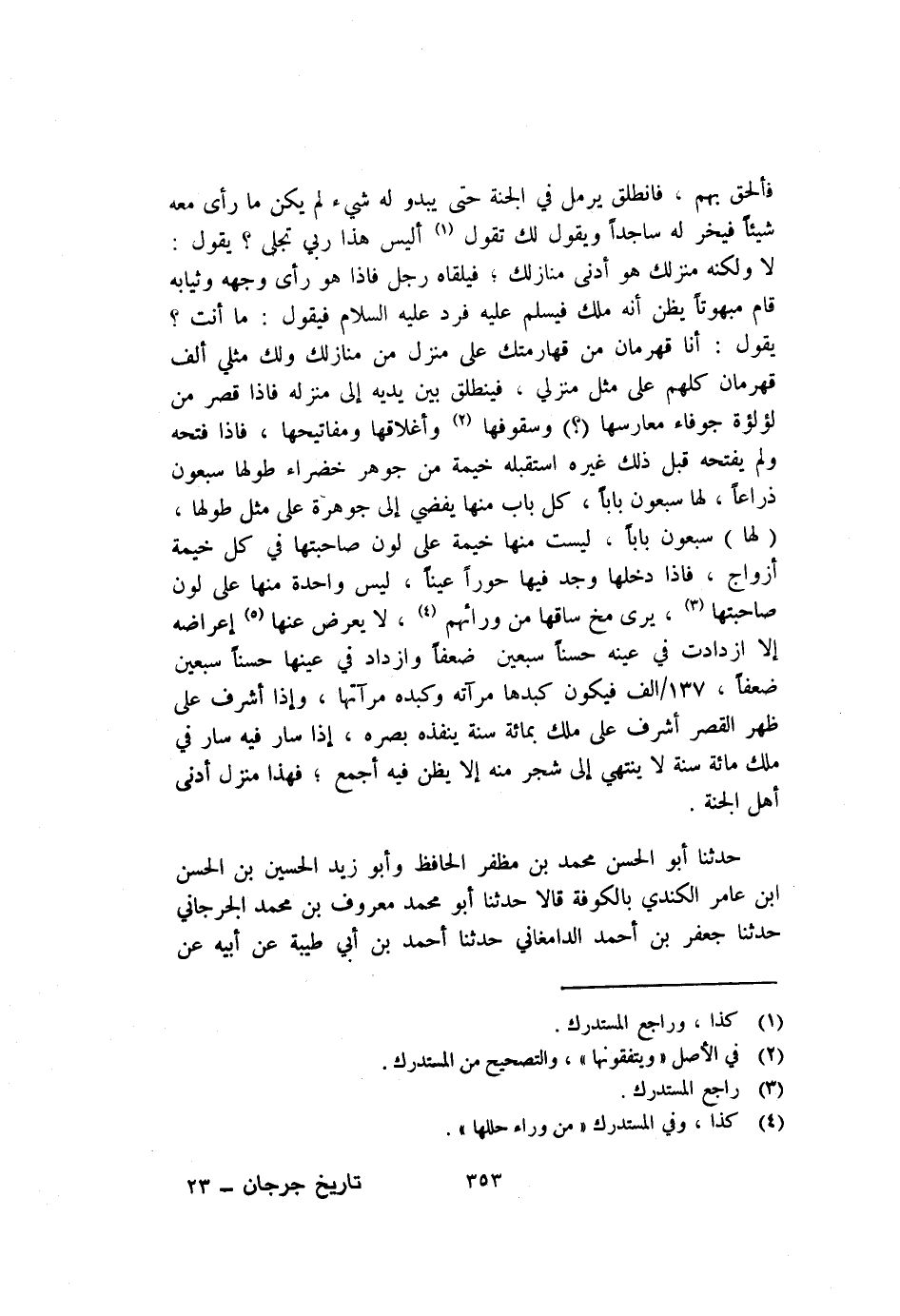 فَأُلْحِقَ بِهِمْ فَانْطَلَقَ يَرْمِلُ فِي الْجَنَّةِ حَتَّى يَبْدُو لَهُ شَيْءٌ لَمْ يَكُنْ مَا رَأَى مَعَهُ شَيْئًا فَيَخِرُّ لَهُ سَاجِدًا وَيَقُولُ لك تقول 1 أَلَيْسَ هَذَا رَبِّي تَجَلَّى؟ يَقُولُ: لا وَلَكِنَّهُ مَنْزِلُكَ هُوَ أَدْنَى مَنَازِلِكَ فَيَلْقَاهُ رَجُلٌ فَإِذَا هُوَ رَأَى وَجْهَهُ وَثِيَابَهُ قَامَ مَبْهُوتًا يَظُنُّ أَنَّهُ مَلَكٌ فَيُسَلِّمُ عَلَيْهِ فَرَدَّ عَلَيْهِ السَّلامَ فَيَقُولُ مَا أَنْتَ يَقُولُ أَنَا قَهْرَمَانٌ مِنْ قَهَارِمَتِكَ عَلَى مَنْزِلٍ مِنْ مَنَازِلِكَ وَلَكَ مِثْلِي أَلْفُ قَهْرَمَانٍ كُلُّهُمْ عَلَى مِثْلِ مَنْزِلِي فَيَنْطَلِقُ بَيْنَ يَدَيْهِ إِلَى مَنْزِلِهِ فَإِذَا قَصْرٌ مِنْ لَؤْلُؤَةٍ جَوْفَاءَ مَعَارِسهَا وَسُقُوفهَا 2 وَأَغْلاقهَا وَمَفَاتِيحهَا فَإِذَا فَتَحَهُ وَلَمْ يَفْتَحْهُ قَبْلَ ذَلِكَ غَيْرُهُ اسْتَقْبَلَهُ خَيْمَةٌ مِنْ جَوْهَرٍ خَضْرَاءَ طُولُهَا سَبْعُونَ ذِرَاعًا لَهَا سَبْعُونَ بَابًا كُلُّ بَابٍ مِنْهَا يُفْضِي إِلَى جَوْهَرَةٍ عَلَى مِثْلِ طُولِهَا لَهَا سَبْعُونَ بَابًا لَيْسَتْ مِنَهَا خَيْمَةٌ عَلَى لَوْنِ صَاحِبَتِهَا فِي كُلِّ خَيْمَةٍ أَزْوَاجٌ فَإِذَا دَخَلَهَا وَجَدَ فِيهَا حُورًا عِينًا لَيْسَ وَاحِدَةٌ مِنْهَا عَلَى لَوْنِ صَاحِبَتِهَا 3 يَرَى مُخَّ سَاقِهَا مِنْ وَرَائِهِمْ 4 لا يَعْرِضُ عَنْهَا 5 إِعْرَاضَةً إِلا ازْدَادَتْ فِي عَيْنِهِ حُسْنًا سَبْعِينَ ضِعْفًا وَازْدَادَ فِي عَيْنِهَا حُسْنًا سَبْعِينَ ضعفا 137/ألف فَيَكُونُ كَبِدُهَا مِرْآتَهُ وَكَبِدُهُ مِرْآتَهَا وَإِذَا أَشْرَفَ عَلَى ظَهْرِ الْقَصْرِ أَشْرَفَ عَلَى مُلْكٍ بِمَائَةِ سَنَةٍ ينْفِذه بَصَرُهُ إِذَا سَارَ فِيهِ سَارَ فِي مُلْكِ مَائَةِ سَنَةٍ لا يَنْتَهِي إِلَى شَجَرٍ مِنْهُ إِلاَّ يَظُنُّ فِيهِ أَجْمَعُ فَهَذَا مَنْزِلُ أَدْنَى أَهْلِ الْجَنَّةِ".
