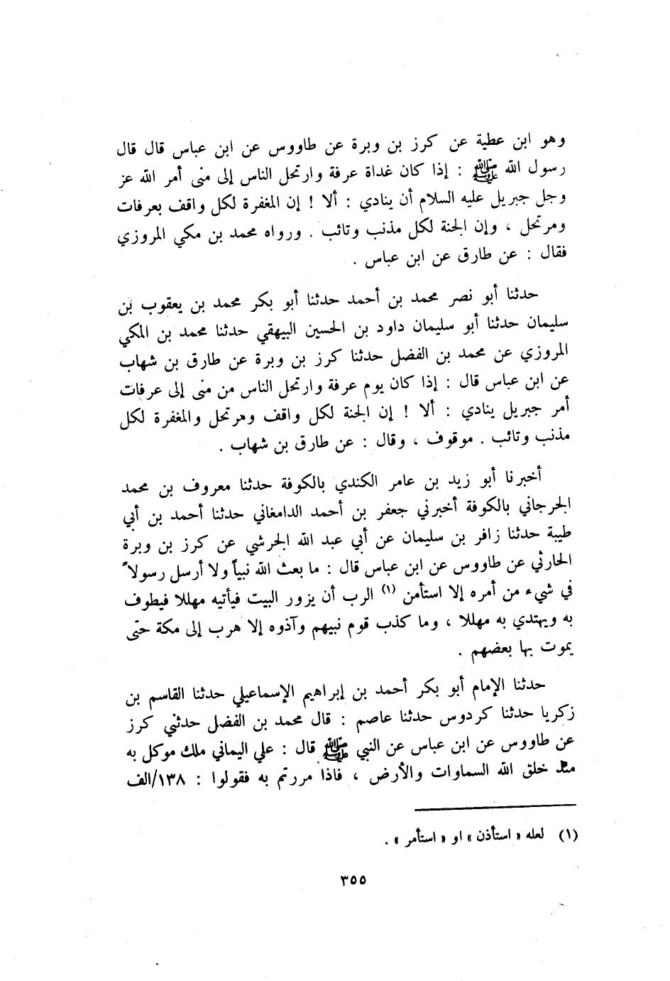 حَدَّثَنَا أَبُو نَصْرٍ مُحَمَّدُ بْنُ أَحْمَدَ حَدَّثَنَا أَبُو بَكْرٍ مُحَمَّدُ بْنُ يَعْقُوبَ بْنِ سُلَيْمَانَ حَدَّثَنَا أَبُو سُلَيْمَانَ دَاوُدُ بْنُ الْحُسَيْنِ الْبَيْهَقِيُّ حَدَّثَنَا مُحَمَّدُ بْنُ الْمَكِّيِّ الْمَرْوَزِيُّ عَنْ مُحَمَّدِ بْنِ الْفَضْلِ حَدَّثَنَا كَرْزُ بْنُ وَبَرَةُ عَنْ طَارِقِ بْنِ شِهَابٍ عَنِ بن عَبَّاسٍ قَالَ إِذَا كَانَ يَوْمُ عَرَفَةَ وَارْتَحَلَ النَّاسُ مِنْ مِنًى إِلَى عَرَفَاتٍ أُمِرَ جِبْرِيلُ يُنَادِي أَلا إِنَّ الْجَنَّةَ لِكُلِّ وَاقِفٍ وَمُرْتَحِلٍ وَالْمَغْفِرَةَ لِكُلِّ مُذْنِبٍ وَتَائِبٍ موقوف وَقَالَ عَنْ طارق بْن شهاب.