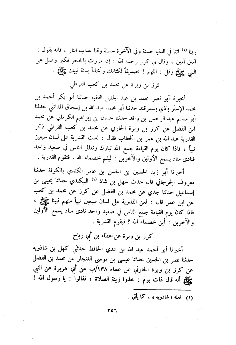 أَخْبَرَنَا أَبُو زَيْدٍ الْحُسَيْنُ بْن الْحَسَن بْن عامر الكندي بِالْكُوفَةِ حَدَّثَنَا مَعْرُوفٌ الْجُرْجَانِيُّ قَالَ حدث سهل بن شاذ1 البيكندي حَدَّثَنَا يَحْيَى بْنُ إِسْمَاعِيلَ حَدَّثَنَا جَدِّي عَنْ مُحَمَّدِ بْنِ الْفَضْلِ عن كرز عَنْ مُحَمَّدِ بْنِ كَعْبٍ عَنِ بن عُمَرَ قَالَ: لُعِنَ الْقَدَرِيَّةُ عَلَى لِسَانِ سَبْعِينَ نَبِيًّا مِنْهُمْ نَبِيُّنَا صَلَّى اللَّهُ عَلَيْهِ وَسَلَّمَ فَإِذَا كَانَ يَوْمُ الْقِيَامَةَ جُمِعَ النَّاسُ فِي صَعِيدٍ وَاحِدٍ نَادَى مُنَادٍ يُسْمِعُ الأَوَّلِينَ وَالآَخِرِينَ أَيْنَ خُصَمَاءُ اللَّهِ فَيَقُومُ الْقَدَرِيَّةُ.