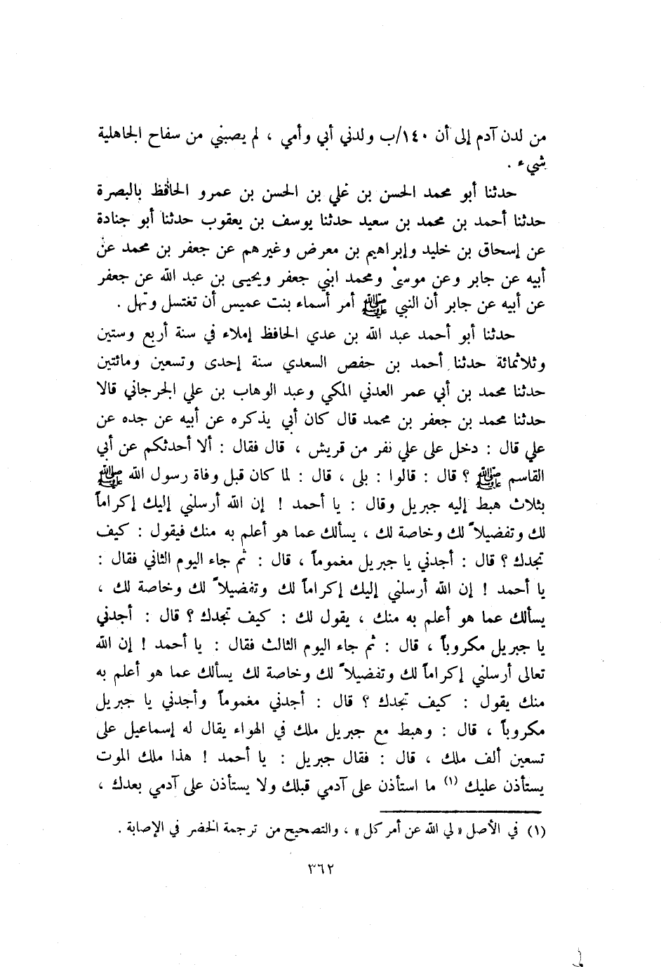 مِنْ لَدُنِ آَدَمَ إِلَى أَنْ 140/ب وَلَدَنِي أَبِي وَأُمِّي لَمْ يُصِبْنِي مِنْ سِفَاحِ الْجَاهِلِيَّةِ شَيْءُ. حَدَّثَنَا أَبُو مُحَمَّدٍ الْحَسَنُ بْنُ عَلِيِ بْنِ الْحَسَنِ بْنِ عَمْرٍو الْحَافِظُ بالبصرة حَدَّثَنَا أَحْمَد بْن مُحَمَّد بْنِ سَعِيدٍ حَدَّثَنَا يُوسُفُ بْنُ يَعْقُوبَ حَدَّثَنَا أَبُو جُنَادَةَ عَنْ إِسْحَاقَ بْنِ خُلَيْدٍ وَإِبْرَاهِيمَ بْنِ مُعَرِّضٍ وَغَيْرِهِمْ عَنْ جَعْفَرِ بْنِ مُحَمَّدٍ عَنْ أَبِيهِ عَنْ جَابِرٍ وَعَنْ مُوسَى وَمُحَمَّدٍ ابْنَي جَعْفَرٍ وَيَحْيَى بْنِ عَبْدِ اللَّهِ عَنْ جَعْفَرٍ عَنْ أَبِيهِ عَنْ جَابِرٍ أَن ّالنَّبِيَّ صَلَّى اللَّهُ عَلَيْهِ وَسَلَّمَ أَمَرَ أَسْمَاءَ بِنْتَ عُمَيْسٍ أَنْ تَغْتَسِلَ وَتُهِلَّ. حَدَّثَنَا أَبُو أَحْمَد عَبْد اللَّهِ بْن عدي الْحَافِظُ إِمْلاءً فِي سَنَة أَرْبَعٍ وَسِتِّينَ وَثَلاثُمَائَةٍ حَدَّثَنَا أَحْمَدُ بْنُ حَفْصٍ السَّعْدِيُّ سَنَةَ إِحْدَى وَتِسْعِينَ ومائتين حَدَّثَنَا مُحَمَّد بْن أَبِي عُمَرَ الْعَدَنِيُّ الْمَكِّيُّ وَعَبْدُ الْوَهَّابِ بْن عَلِي الْجُرْجَانِيّ قَالا حَدَّثَنَا مُحَمَّد بْن جعفر بْن مُحَمَّد قَالَ: كَانَ أَبِي يذكره عَن أَبِيهِ عَن جده عَن عَلِي قَالَ: دَخَلَ عَلَى عَلِيٍّ نَفَرٌ مِنْ قُرَيْشٍ قَالَ: فَقَالَ: أَلا أُحَدِّثُكُمْ عَنْ أَبِي الْقَاسِمِ صَلَّى اللَّهُ عَلَيْهِ وَسَلَّمَ قَالَ: قَالُوا: بَلَى قَالَ: لَمَّا كَانَ قَبْلَ وَفَاةِ رَسُولِ اللَّهِ صَلَّى اللَّهُ عَلَيْهِ وَسَلَّمَ بِثَلاثٍ هَبَطَ إِلَيْهِ جِبْرِيلُ وَقَالَ: يَا أَحْمَدُ إِنَّ اللَّهَ أَرْسَلَني إِلَيْكَ إِكْرَامًا لَكَ وَتَفْضِيلا لَكَ وَخَاصَّةً لَكَ يَسْأَلُكَ عَمَّا هُوَ أَعْلَمُ بِهِ مِنْكَ فَيَقُولُ: كَيْفَ تَجِدُكَ؟ قَالَ: "أَجِدُنِي يَا جِبْرِيلَ مَغْمُومًا" قَالَ: ثُمَّ جَاءَ الْيَوْمَ الثَّانِي, فَقَالَ: يَا أَحْمَدُ إِنَّ اللَّهَ أَرْسَلَني إِلَيْكَ إِكْرَامًا لَكَ وَتَفْضِيلا لَكَ وَخَاصَّةً لَكَ يَسْأَلُكَ عَمَّا هُوَ أَعْلَمُ بِهِ مِنْكَ يَقُولُ لَكَ كَيْفَ تَجِدُكَ؟ قَالَ: "أَجِدُنِي يَا جِبْرِيلَ مَكْرُوبًا" قَالَ: ثُمَّ جَاءَ الْيَوْمَ الثَّالِثِ فَقَالَ: يَا أَحْمَدُ إِنَّ اللَّهَ تَعَالَى أَرْسَلَنِي إِكْرَامًا لَكَ وَتَفْضِيلا لَكَ وَخَاصَّةً لَكَ يَسْأَلُكَ عَمَّا هُوَ أَعْلَمُ بِهِ مِنْكَ يَقُول كَيْفَ تَجِدُكَ؟ قَالَ: "أَجِدُنِي مَغْمُومًا وَأَجِدُنِي يَا جِبْرِيلُ مَكْرُوبًا" قَالَ: وَهَبَطَ مَعَ جِبْرِيلَ مَلِكٌ فِي الْهَوَاءِ يُقَالُ لَهُ: إِسْمَاعِيلُ عَلَى تِسْعِينَ أَلْفَ مَلَكٍ قَالَ: فَقَالَ جَبْرِيلُ: يَا أَحْمَدُ هَذَا مَلَكُ الْمَوْتِ يَسْتَأْذِنُ عَلَيْكَ1 مَا اسْتَأْذَنَ عَلَى آَدَمِيٍّ قَبْلَكَ وَلا يستأذن على آدمي بعدك،