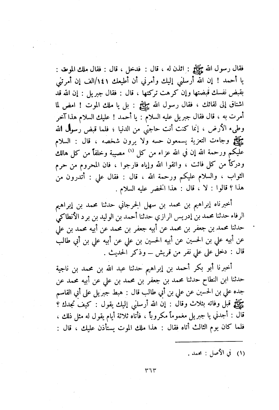 أَخْبَرَنَا أَبُو بَكْرٍ أَحْمَدُ بْنُ إِبْرَاهِيمَ حَدَّثَنَا عَبْد اللَّهِ بْن مُحَمَّد بْن ناجية حدثنا بن النَّطَاحِ حَدَّثَنَا مُحَمَّدُ بْنُ جَعْفَرِ بْنِ مُحَمَّدِ بْنِ عَلِيٍّ عَنْ أبيه مُحَمَّدٍ عَنْ جَدِّهِ عَلِيِّ بْنِ الْحُسَيْنِ عَنْ عَلِيِّ بْنِ أَبِي طَالِبٍ قَالَ هَبَطَ جِبْرِيلُ عَلَى أَبِي الْقَاسِمِ صَلَّى اللَّهُ عَلَيْهِ وَسَلَّمَ قَبْلَ وَفَاتِهِ بِثَلاثٍ وَقَالَ إِنَّ اللَّهَ أَرْسَلَنِي إِلَيْكَ يَقُولُ كَيْفَ تَجِدُكَ؟ قَالَ: "أَجِدُنِي يَا جِبْرِيلُ مَغْمُومًا مَكْرُوبًا" فَأَتَاهُ ثَلاثَةَ أَيَّامٍ يَقُول لَهُ مِثْلَ ذَلِكَ فَلَمَّا كَانَ يَوْمُ الثَّالِثِ أَتَاهُ فَقَالَ هَذَا مَلَكُ الْمَوْتِ يَسْتَأْذِنُ عليك قال: