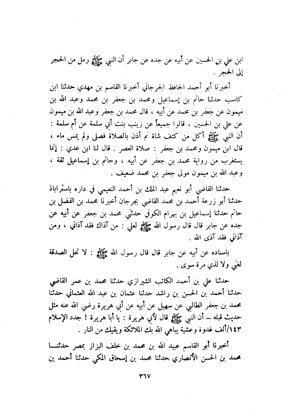 حَدَّثَنَا الْقَاضِي أَبُو نُعَيْمٍ عَبْدُ الْمَلِكِ بْنُ أَحْمَدَ النعيمي فِي داره بِإسْتَرَابَاذَ حَدَّثَنَا أَبُو زرعة أَحْمَد بْن مُحَمَّدٍ الْقَاضِي بِجُرْجَانَ أَخْبَرَنَا مُحَمَّدُ بْنُ الْفَضْلِ بْنُ حَاتِمٍ حَدَّثَنَا إِسْمَاعِيلُ بْنُ بَهْرَامَ الْكُوفِيُّ حَدَّثَنِي مُحَمَّدُ بْنُ جَعْفَرٍ عَنْ أَبِيهِ عَنْ جَدِّهِ عَنْ جَابِرٍ قَالَ: قَالَ رَسُولُ اللَّهِ صَلَّى اللَّهُ عَلَيْهِ وَسَلَّمَ لِعَلِيٍّ: "مِنْ آَذَاكَ فَقَدْ آَذَانِي وَمَنْ آَذَانِي فَقَدْ آَذَى اللَّهَ".