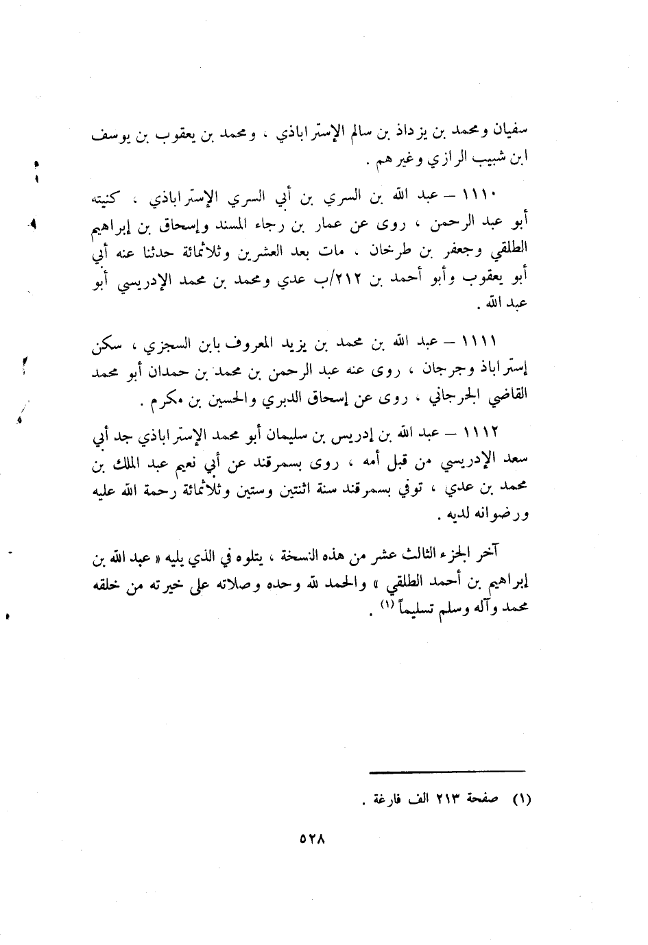 1112- عَبْد اللَّهِ بْن إِدْرِيس بْن سُلَيْمَان أَبُو مُحَمَّد الإِسْتَرَابَاذِي جد أَبِي سَعْد الإدريسي من قبل أمه رَوَى بسمرقند عَنْ أَبِي نعيم عَبْدُ الْمَلِكِ بْنُ مُحَمَّدِ بْنِ عَدِي توفي بسمرقند سَنَة اثنتين وستين وثلاثمائة رحمة اللَّه عَلَيْهِ ورضوانه لديه.