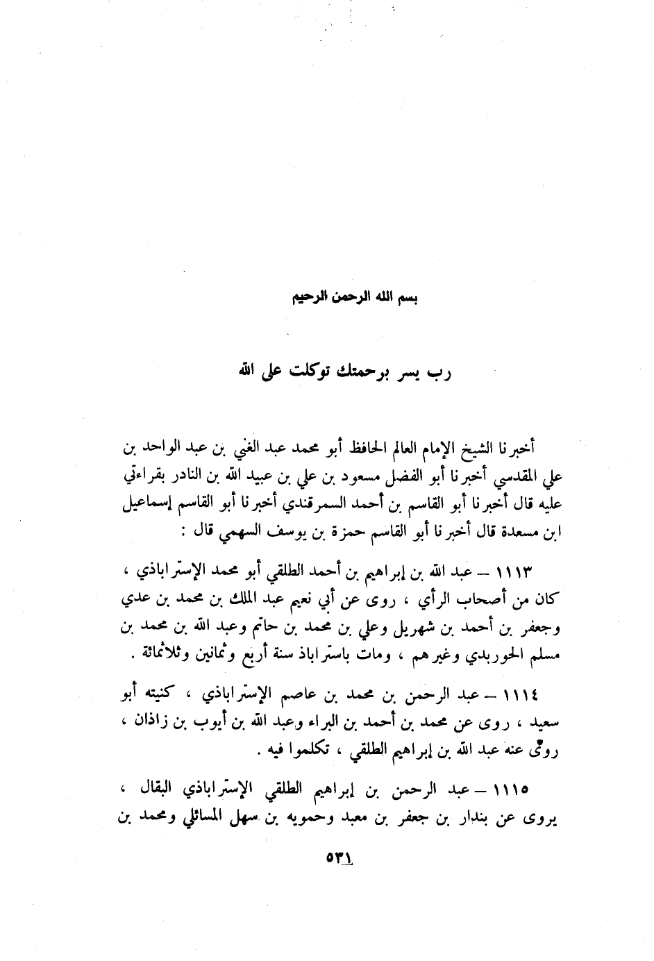 1115- عَبْد الرَّحْمَنِ بْن إِبْرَاهِيم الطلقي الإِسْتَرَابَاذِي البقال يروى عَنِ بندار بْن جَعْفَر بْن معبد وحمويه بْن سَهْل المسائلي ومحمد بْن