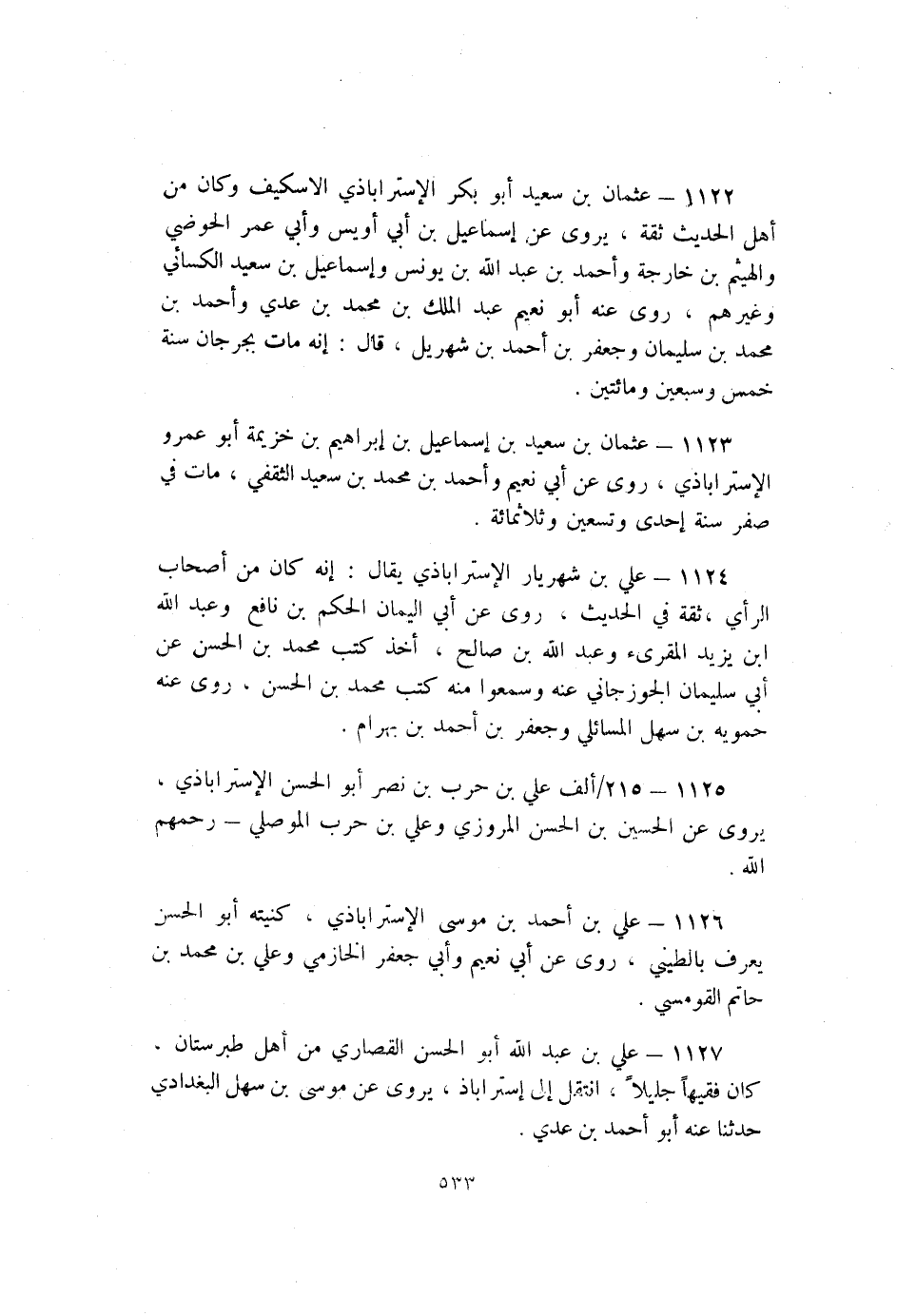 1123- عُثْمَان بْن سَعِيد بْن إِسْمَاعِيل بْن إِبْرَاهِيم بْن خزيمة أَبُو عَمْرو الإِسْتَرَابَاذِي رَوَى عَنْ أَبِي نعيم وَأَحْمَد بْن مُحَمَّد بْن سَعِيد الثقفي مَات فِي صفر سَنَة إحدى وتسعين وثلاثمائة