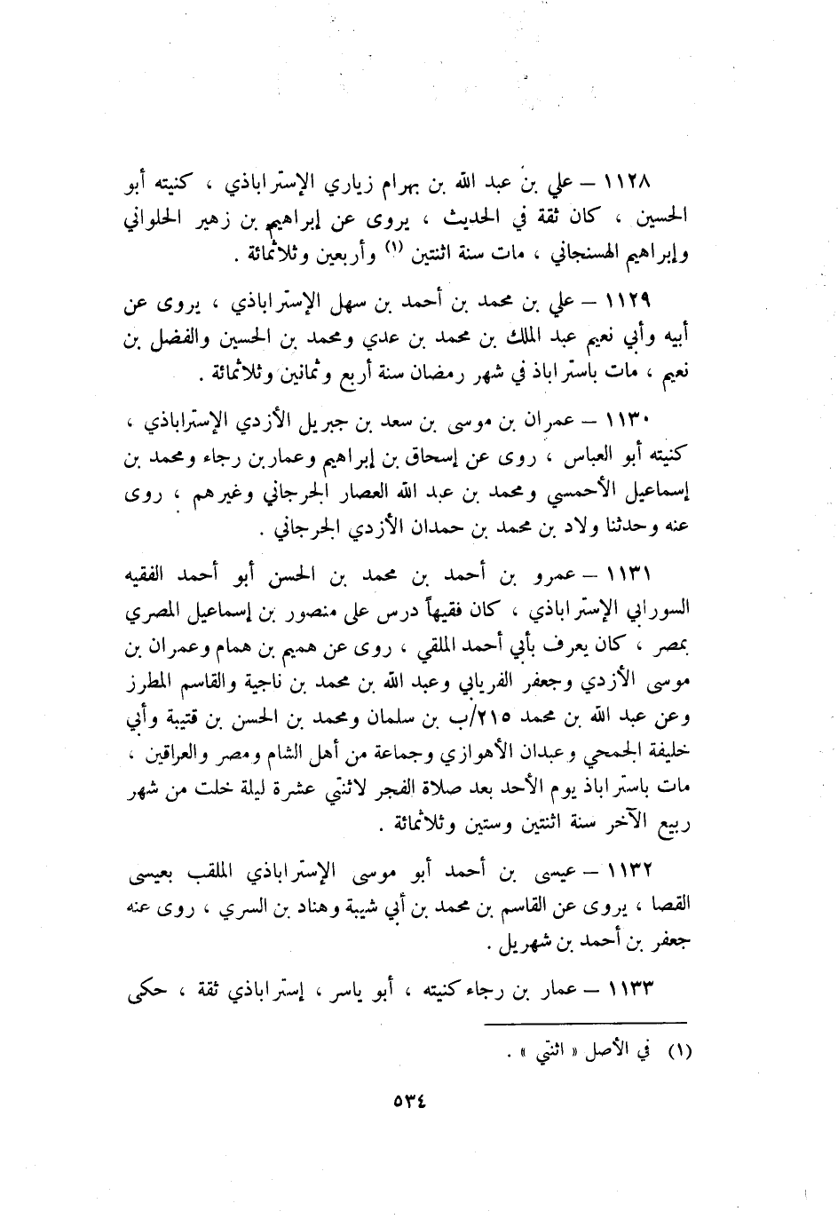 1130- عِمْرَان بْن مُوسَى بْن سَعْد بْن جِبْرِيل الأزدي الإِسْتَرَابَاذِي كنيته أَبُو الْعَبَّاس رَوَى عَنْ إِسْحَاق بْن إِبْرَاهِيم وعمار بْن رجاء ومحمد بْن إِسْمَاعِيل الأحمسي ومحمد بْن عَبْد اللَّهِ العصار الْجُرْجَانِي وغيرهم رَوَى عَنْهُ وَحَدَّثَنَا ولاد بْن مُحَمَّد بْن حمدان الأزدي الْجُرْجَانِي.