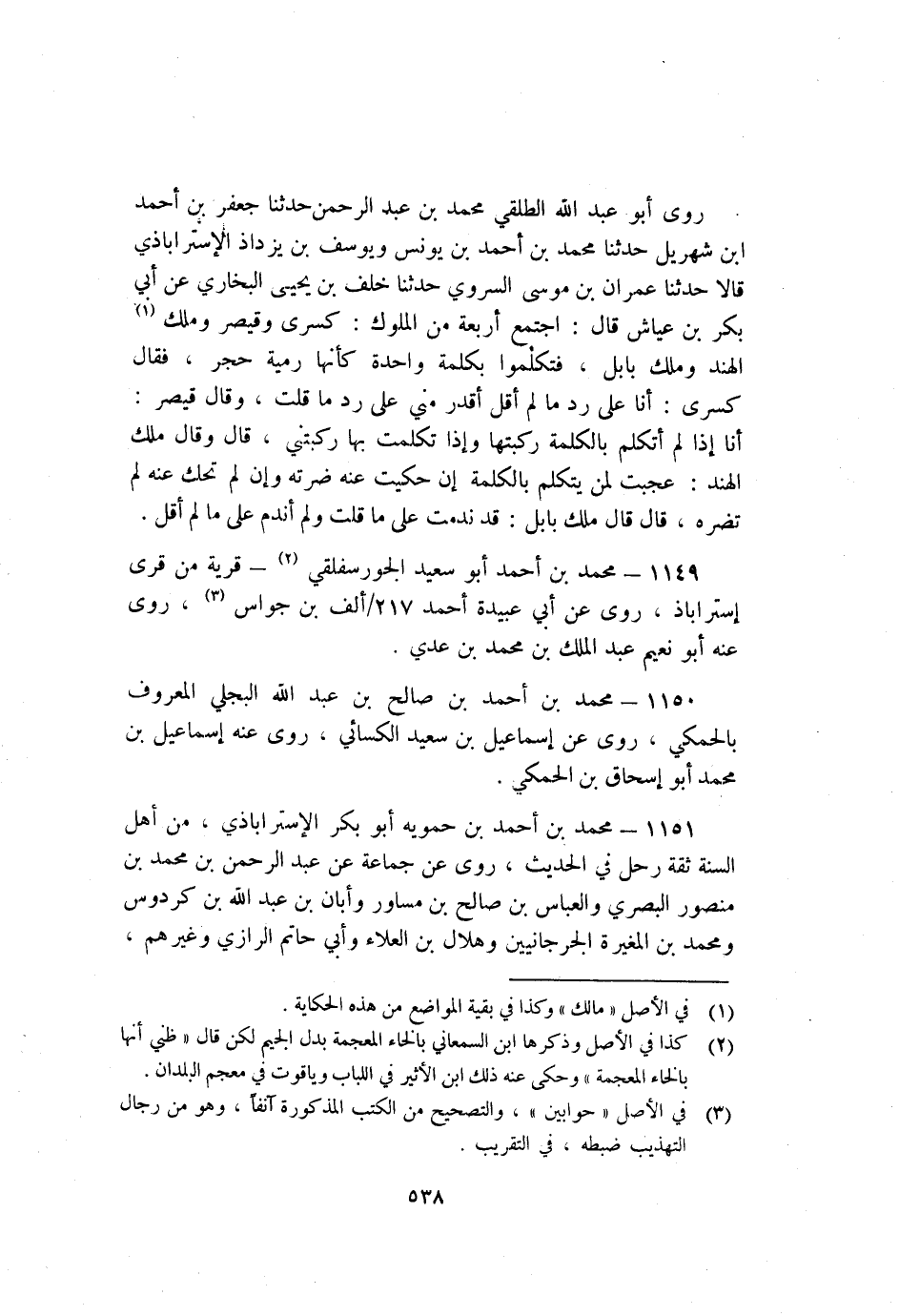 1151- مُحَمَّد بْن أَحْمَدَ بْن حمويه أَبُو بَكْر الإِسْتَرَابَاذِي من أَهْل السنة ثقة رحل فِي الْحَدِيث رَوَى عَنْ جَمَاعَة عَنْ عَبْد الرَّحْمَنِ بْن مُحَمَّد بْن مَنْصُور الْبَصْرِي والعباس بْن صَالِح بْن مساور وأبان بْن عَبْد اللَّهِ بْن كردوس ومحمد بْن الْمُغِيرَةَ الجرجانيين وهلال بْن العلاء وأبي حَاتِم الرَّازِي وغيرهم