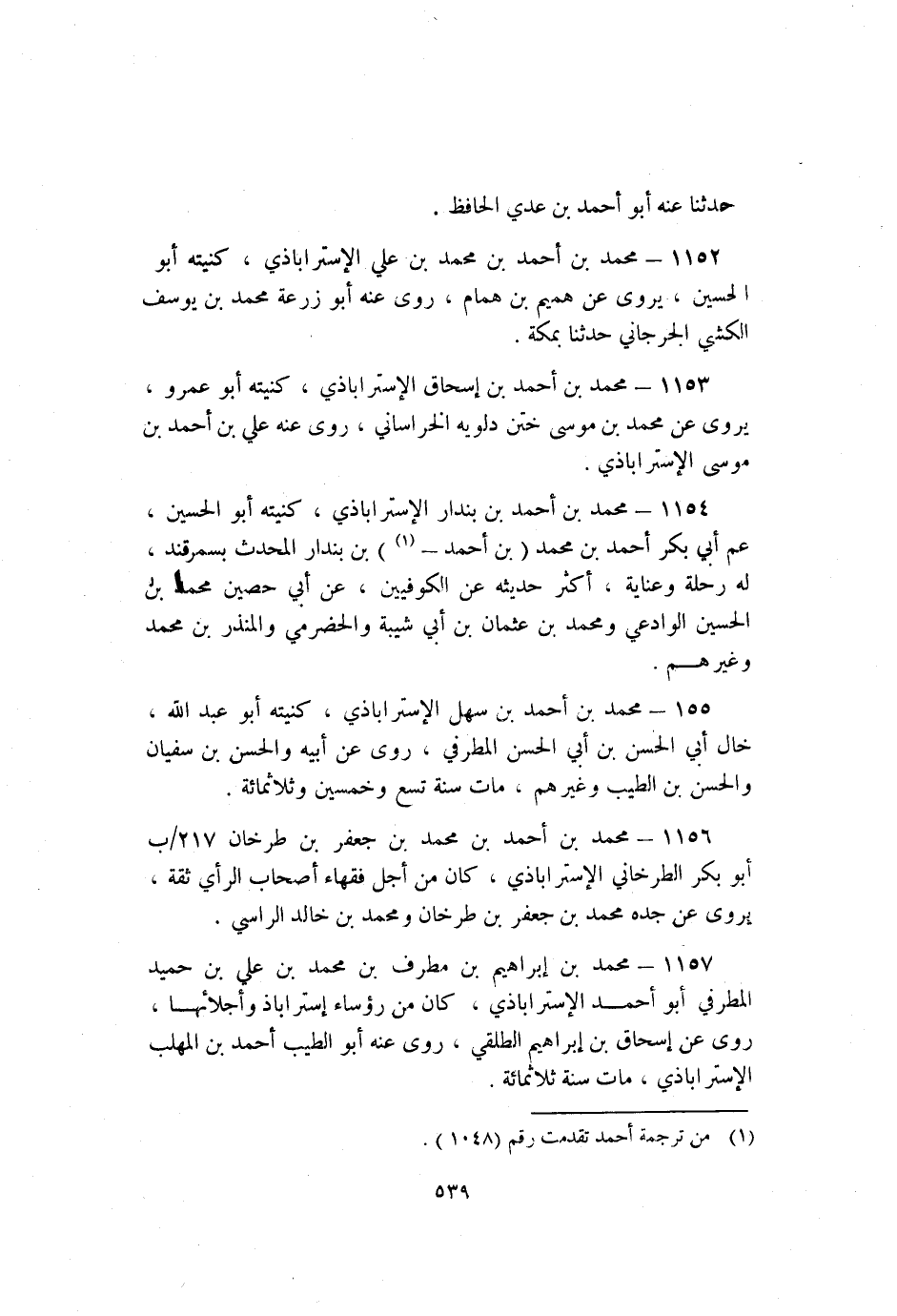 1153- مُحَمَّد بْن أَحْمَدَ بْن إِسْحَاق الإِسْتَرَابَاذِي كنيته أَبُو عَمْرو يروى عَنْ مُحَمَّد بْن مُوسَى ختن دلويه الخراساني رَوَى عَنْهُ عَلِي بْن أَحْمَدَ بْن مُوسَى الإِسْتَرَابَاذِي.