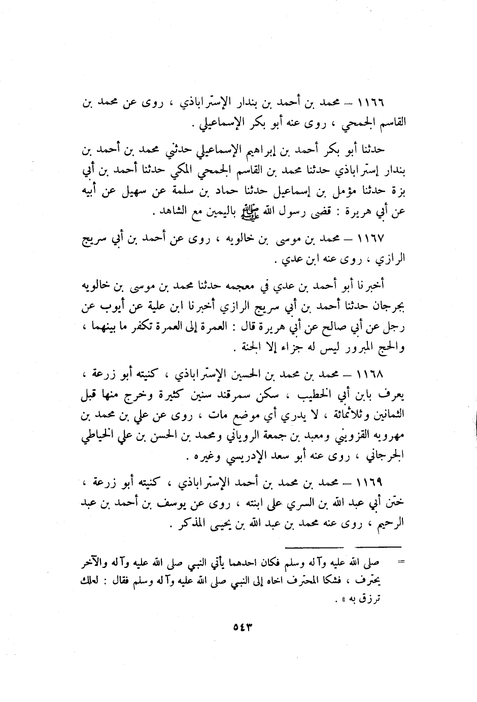 1169- مُحَمَّد بْن مُحَمَّد بْن أَحْمَدَ الإِسْتَرَابَاذِي كنيته أَبُو زُرْعَةَ ختن أَبِي عَبْد اللَّهِ بْن السري عَلَى ابنته رَوَى عَنْ يُوسُف بْن أَحْمَدَ بْن عَبْد الرحيم رَوَى عَنْهُ مُحَمَّد بْن عَبْد اللَّهِ بْن يَحْيَى المذكر.