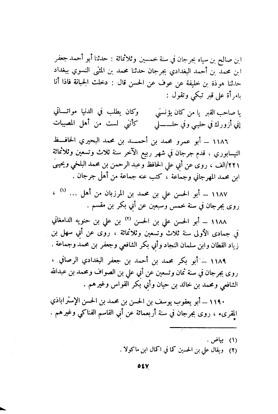 1186 - أَبُو عَمْرو مُحَمَّد بْن أَحْمَدَ بْن مُحَمَّد البحيري الْحَافِظ النَّيْسَابُورِي قدم جُرْجَان فِي شَهْر ربيع الآخر سنة ثلاث وتسعين وثلاثمائة 221/ألف رَوَى عَنْ أَبِي عَلِي الْحَافِظ وعَبْد الرَّحْمَنِ بْن مُحَمَّد الْبَلْخِي وَيَحْيَى بْن مُحَمَّد المهرجاني وجماعة كتب عَنْهُ جَمَاعَة من أَهْل جُرْجَان.