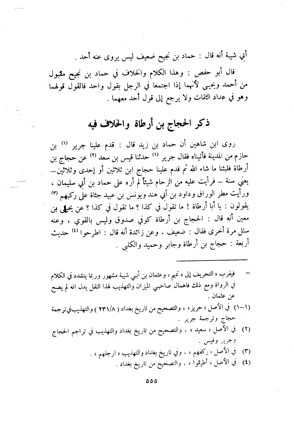 قَالَ أَبُو حفص: وَهَذَا الْكَلام فِي حجاج بْن أرطاة من مثل زائدة بْن قدامة عظيم وَقَدْ وافقه عَلَى ذَلِكَ يَحْيَى بْن معين فِي أحد قوليه وَأَمَّا مَا ذكره حَمَّاد بْن زَيْد فِي حجاج ونبه مَا رأى الْعُلَمَاء يسألونه فليس بداخل فِي الروايات لأنه حكى أَنَّهُ سمعهم يقولون: مَا تقول فِي كَذَا؟ يريد الفقه وَأَبُو حَنِيفَة فَقَدْ كَانَ من الفقه مَا لا يدفع من علمه فِيهِ وَلَمْ يكن فِي الْحَدِيث بالمرضى لأن للأسانيد 223/ألف نقادا فَإِذَا لَمْ يعرف الأستاذ مَا يكتب وَمَا كذب نسب إلى الضعف والله أعلم.