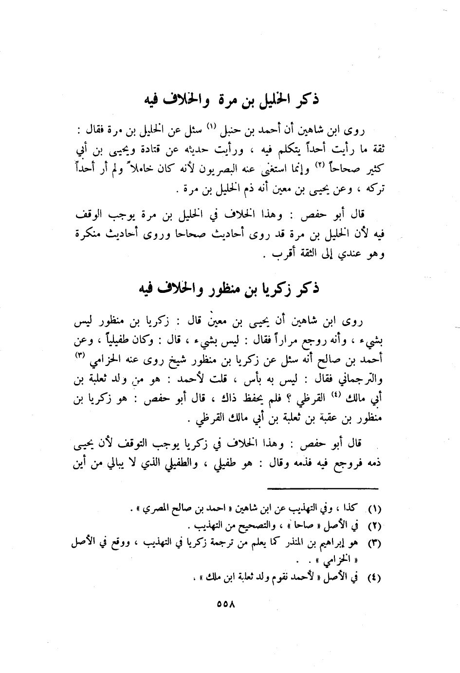 روى بْن شاهين أَن يَحْيَى بْن معين قَالَ زَكَرِيَّا بْن منظور لَيْسَ بشيء وأنه روجع مرارا فَقَالَ لَيْسَ بشيء قَالَ وَكَانَ طفيليا وعن أَحْمَد بْن صَالِح أَنَّهُ سئل عَنْ زَكَرِيَّا بْن منظور شَيْخ رَوَى عَنْهُ الحزامي1 والترجماني فَقَالَ لَيْسَ بِهِ بأس قُلْت لأحمد هُوَ من ولد ثعلبة بْن أَبِي مَالِك2 القرظي فلم يحفظ ذاك قَالَ أَبُو حفص: هُوَ زَكَرِيَّا بْن منظور بْن عقبة بْن ثعلبة بْن أَبِي مَالِك القرظي. قَالَ أَبُو حفص: وَهَذَا الخلاف فِي زَكَرِيَّا يوجب التوقف لأن يَحْيَى ذمه فروجع فِيهِ فذمه وَقَالَ: هُوَ طفيلي والطفيلي الَّذِي لا يبالي من أين كَانَ مطعمه ومن كانت هذه صورته فِي المطعم خفت أَن لا يَكُون مأمونا فِي العلم وَقَدْ مدحه أَحْمَد بْن صَالِح فيوجب الوقف فِيهِ إن شاء الله.