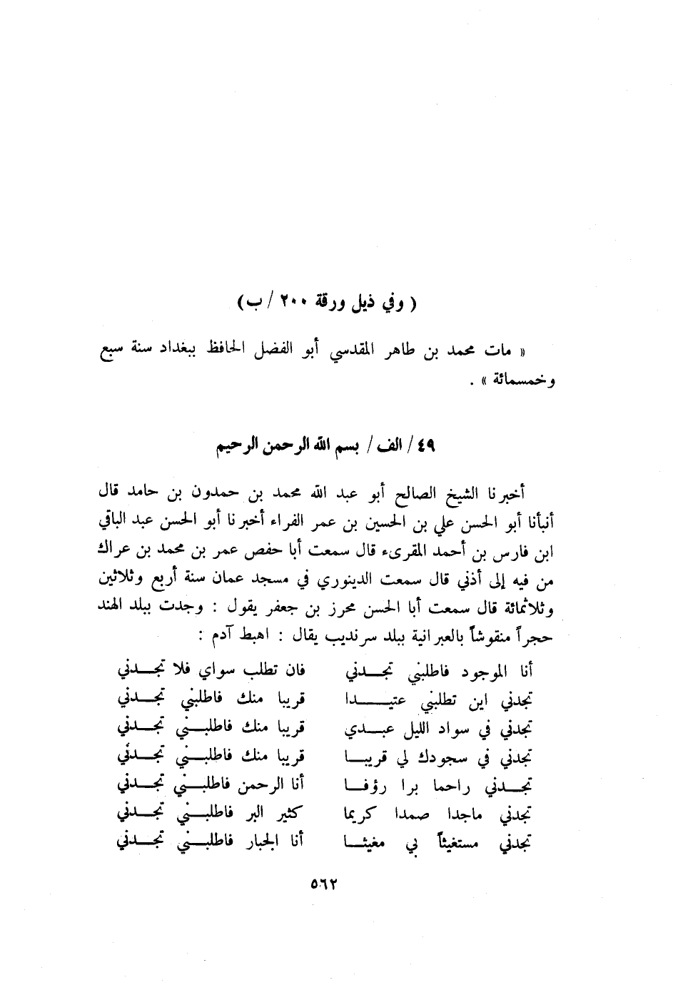 مات محمد بن طاهر المقدسي أبو الفضل الحافظ ببغداد سنة سبع وخمسمائة".