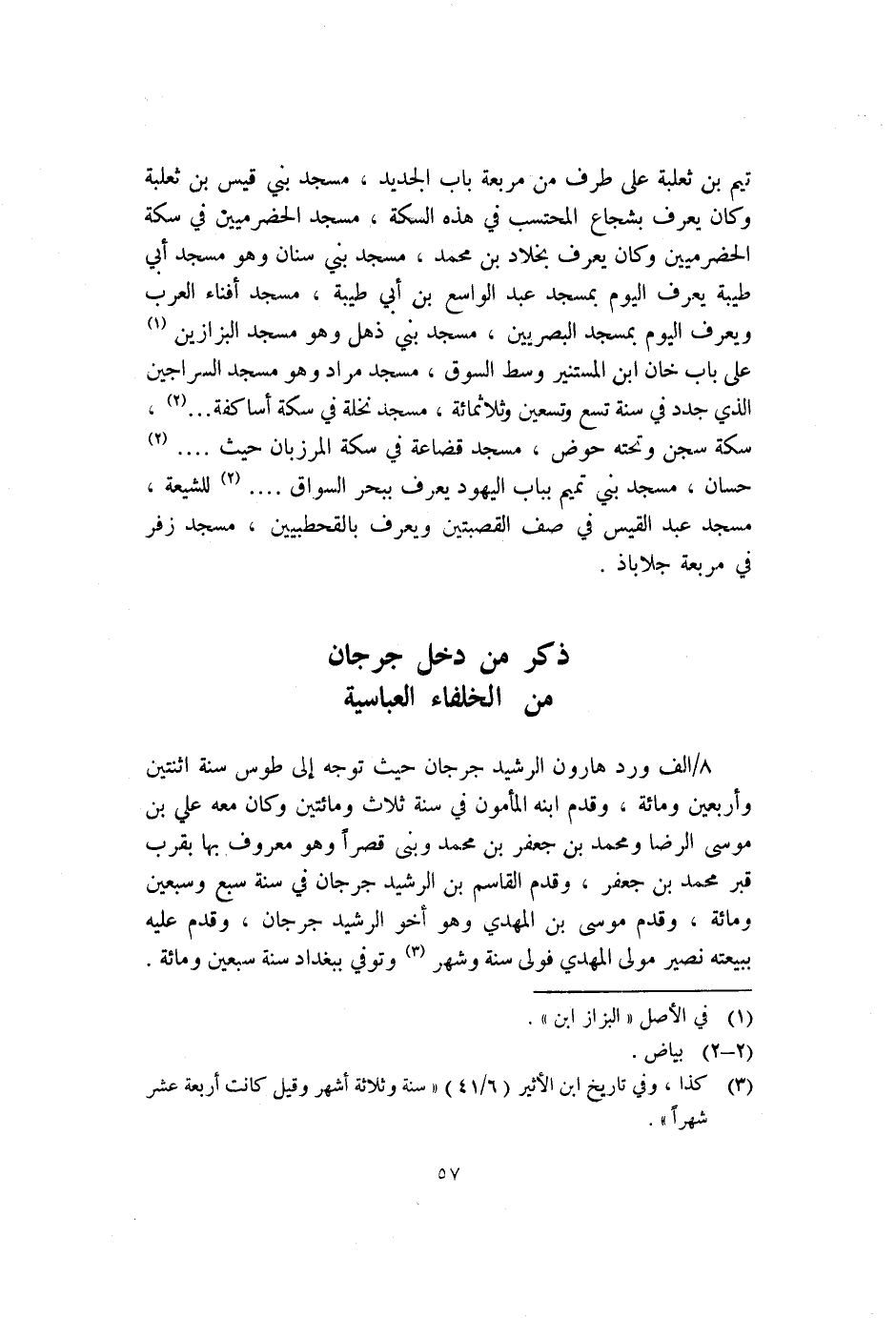 8/ألف ورد هارون الرشيد جُرْجَان حيث توجه إلى طوس سنة اثنتين وأربعين ومائة وقدم ابنه المأمون فِي سنة ثلاث ومائتين وكان معه عَلِيّ بْن مُوسَى الرضا ومحمد بْن جعفر بْن مُحَمَّد وبنى قصرا وهو معروف بها بقرب قبر مُحَمَّد بْن جعفر وقدم القاسم بْن الرشيد جُرْجَان فِي سنة سبع وسبعين ومائة وقدم مُوسَى بْن المهدي وهو أخو الرشيد جُرْجَان وقدم عليه ببيعته نصير مولى المهدي فولى سنة وشهر1 وتوفي ببغداد سنة سبعين ومائة.