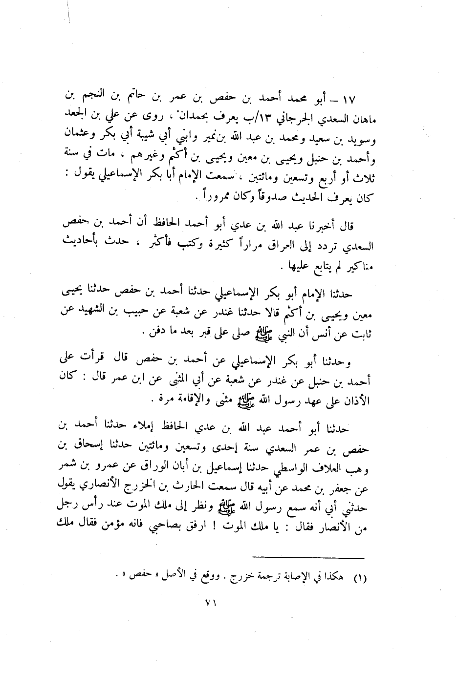 17 - أَبُو مُحَمَّد أَحْمَد بْن حفص بْن عُمَر بْن حَاتِم بْن النجم بْن ماهان السعدي الْجُرْجَانِيّ 13/ب يعرف بحمدان روى عَنْ عَلِيّ بْن الجعد وسويد بْن سعيد ومحمد بْن عَبْد اللَّهِ بْن نمير وابني أَبِي شيبة أَبِي بكر وعثمان وأحمد بْن حنبل ويحيى بْن معين ويحيى بْن أكثم وغيرهم مات فِي سنة ثلاث أَوْ أربع وتسعين ومائتين سمعت الإمام أبا بكر الإسماعيلي يقول كان يعرف الحديث صدوقا وكان ممرورا.
