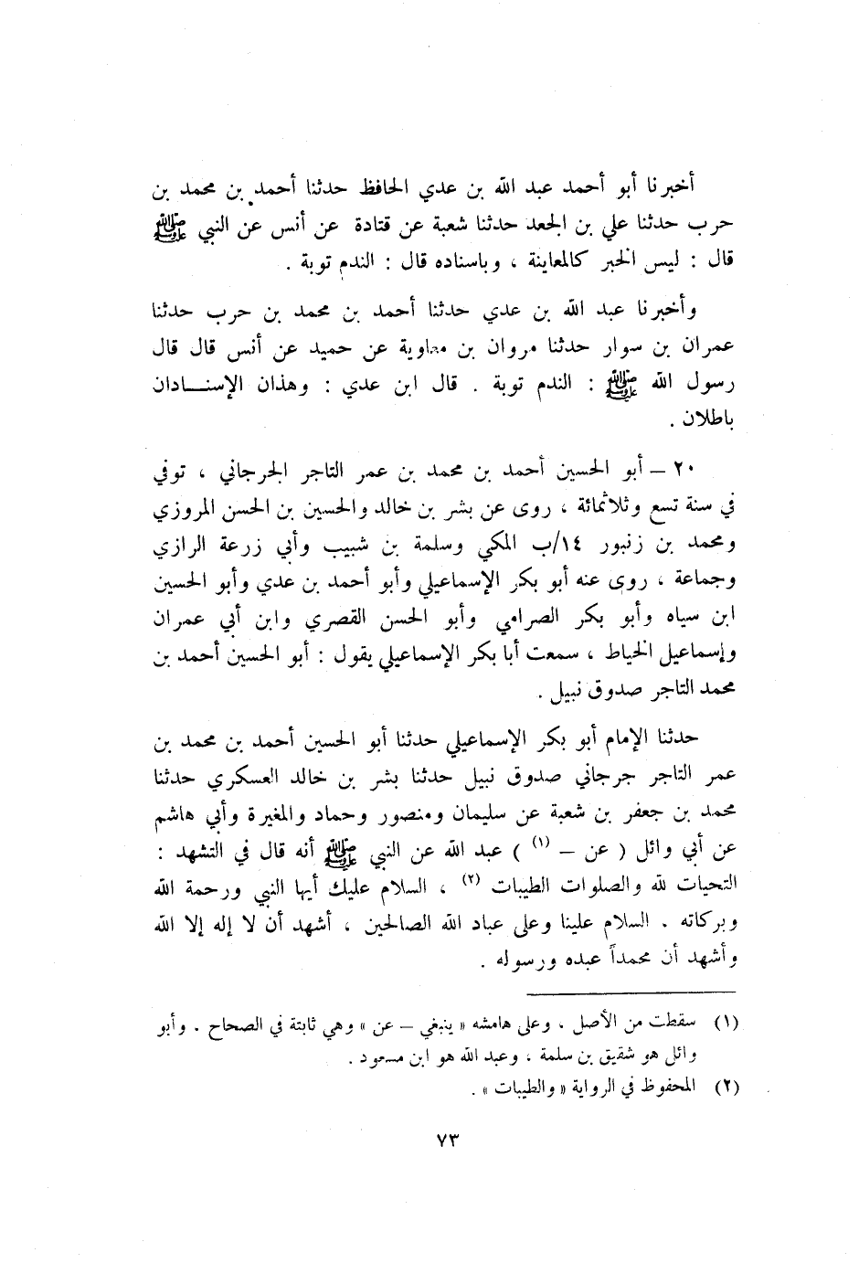 أَخْبَرَنَا أَبُو أَحْمَدَ عَبْدُ اللَّهِ بْنُ عَدِيٍّ الْحَافِظُ حَدَّثَنَا أَحْمَدُ بْنُ مُحَمَّدِ بْنِ حَرْبٍ حَدَّثَنَا عَلِيُّ بْنُ الْجَعْدِ حَدَّثَنَا شُعْبَةُ عَنْ قَتَادَةَ عَنْ أَنَسٍ عَنِ النبي صلى اللَّه عليه وسلم قَالَ: "لَيْسَ الْخَبَرُ كَالْمُعَايِنَةِ" وَبِإِسْنَادِهِ قَالَ: "النَّدَمُ تَوْبَةٌ" وَأَخْبَرَنَا عَبْدُ اللَّهِ بْنُ عَدِيٍّ حَدَّثَنَا أَحْمَدُ بْنُ مُحَمَّدِ بْنِ حَرْبٍ حَدَّثَنَا عِمْرَانُ بْنُ سَوَّارٍ حَدَّثَنَا مَرْوَانُ بْنُ مُعَاوِيَةَ عَنْ حُمَيْد عَنْ أَنَسٍ قَالَ: قَالَ رَسُولُ اللَّهِ صَلَّى اللَّهُ عَلَيْهِ وَسَلَّمَ: "النَّدَمُ تَوْبَةٌ" قَالَ ابْن عدي وهذان الإسنادان باطلان.