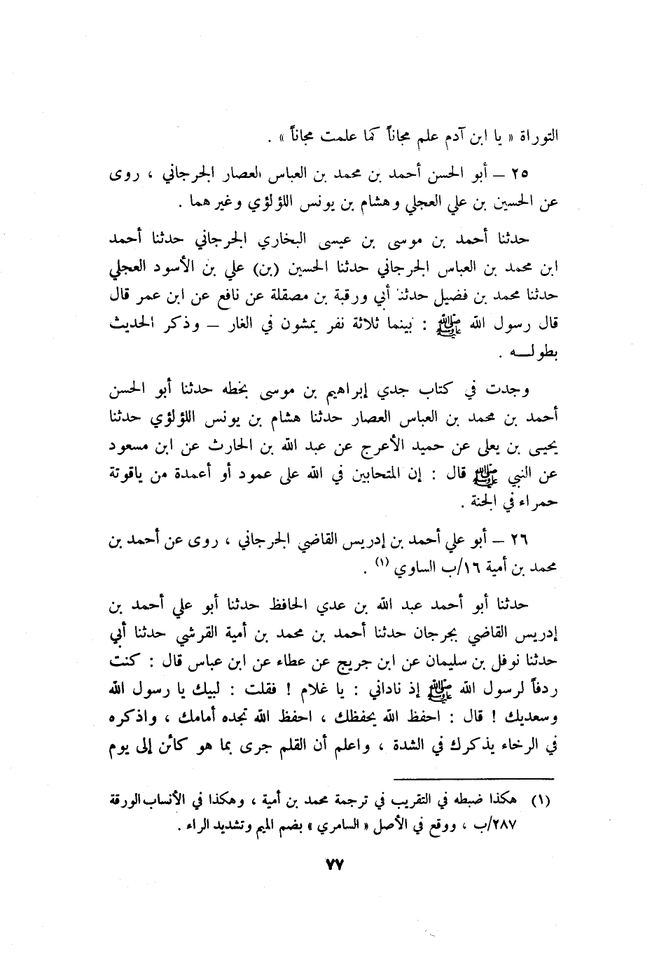 26- أَبُو علي أَحْمَد بْن إِدْرِيس القاضي الْجُرْجَانِيّ روى عَنْ أَحْمَد بْن مُحَمَّد بْن أمية16/ب الساوي1.