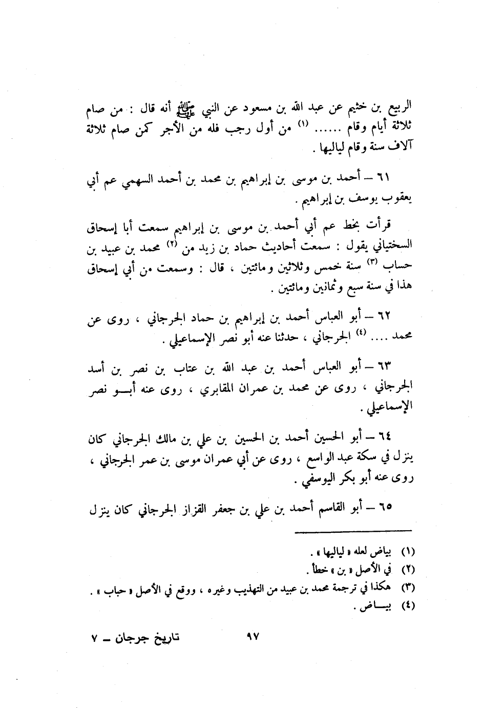 62- أَبُو العباس أَحْمَد بْن إبراهيم بْن حماد الْجُرْجَانِيّ روى عَنْ مُحَمَّد.....4 الْجُرْجَانِيّ حَدَّثَنَا عنه أَبُو نصر الإسماعيلي.